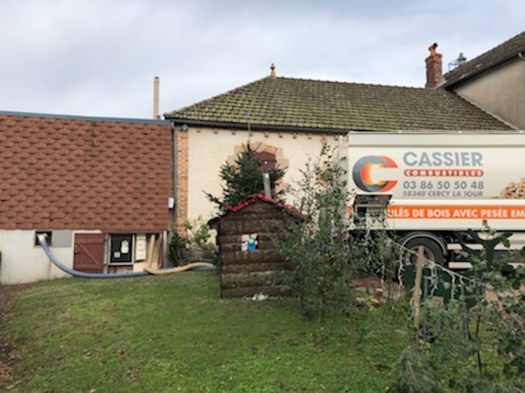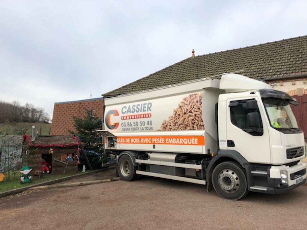 Livraison de granulés de bois en vrac avec notre camion souffleur muni d'une pesée embarquée et d'un aspirateur de fines dans le Morvan, dans la Nièvre (58)