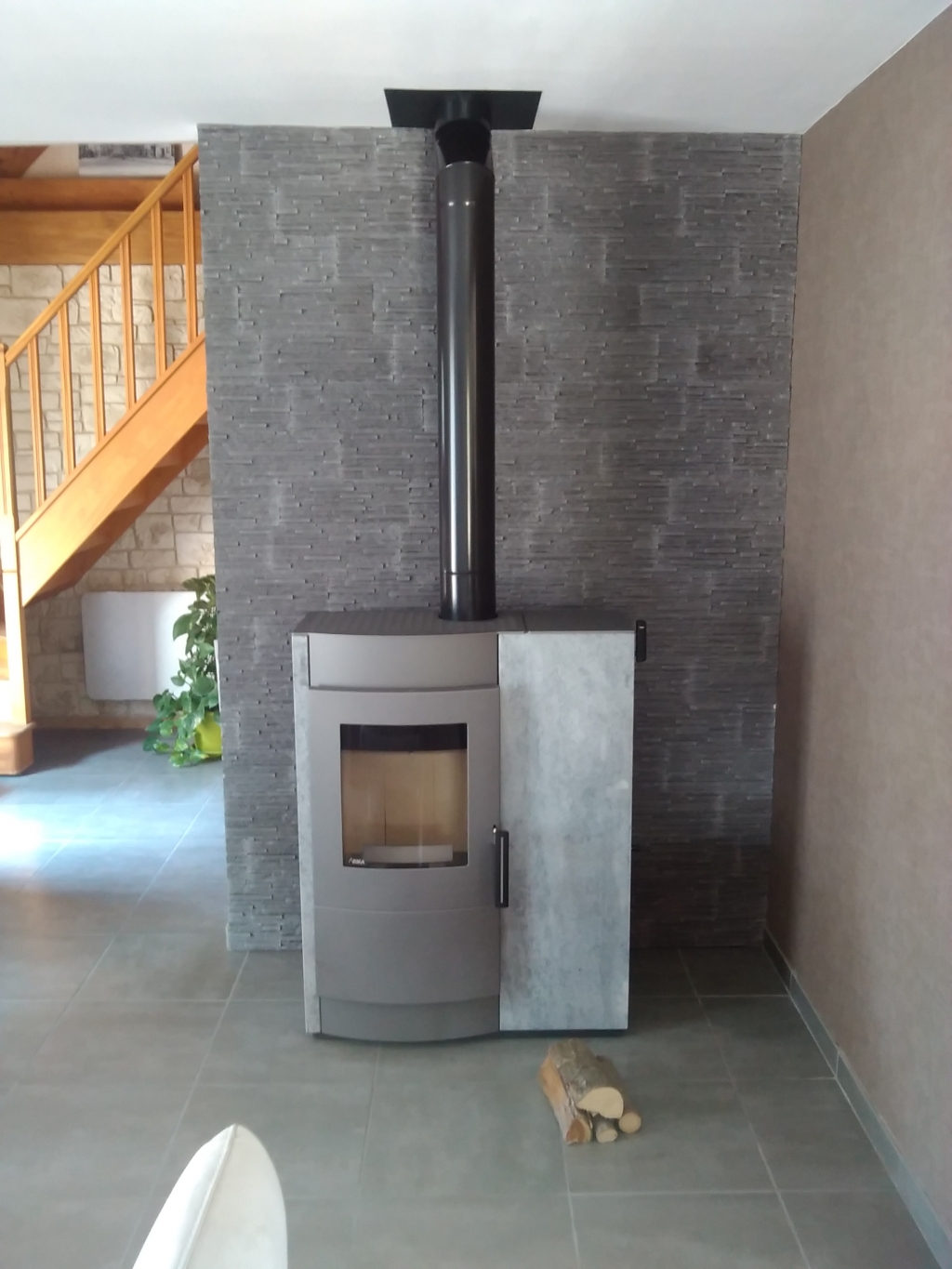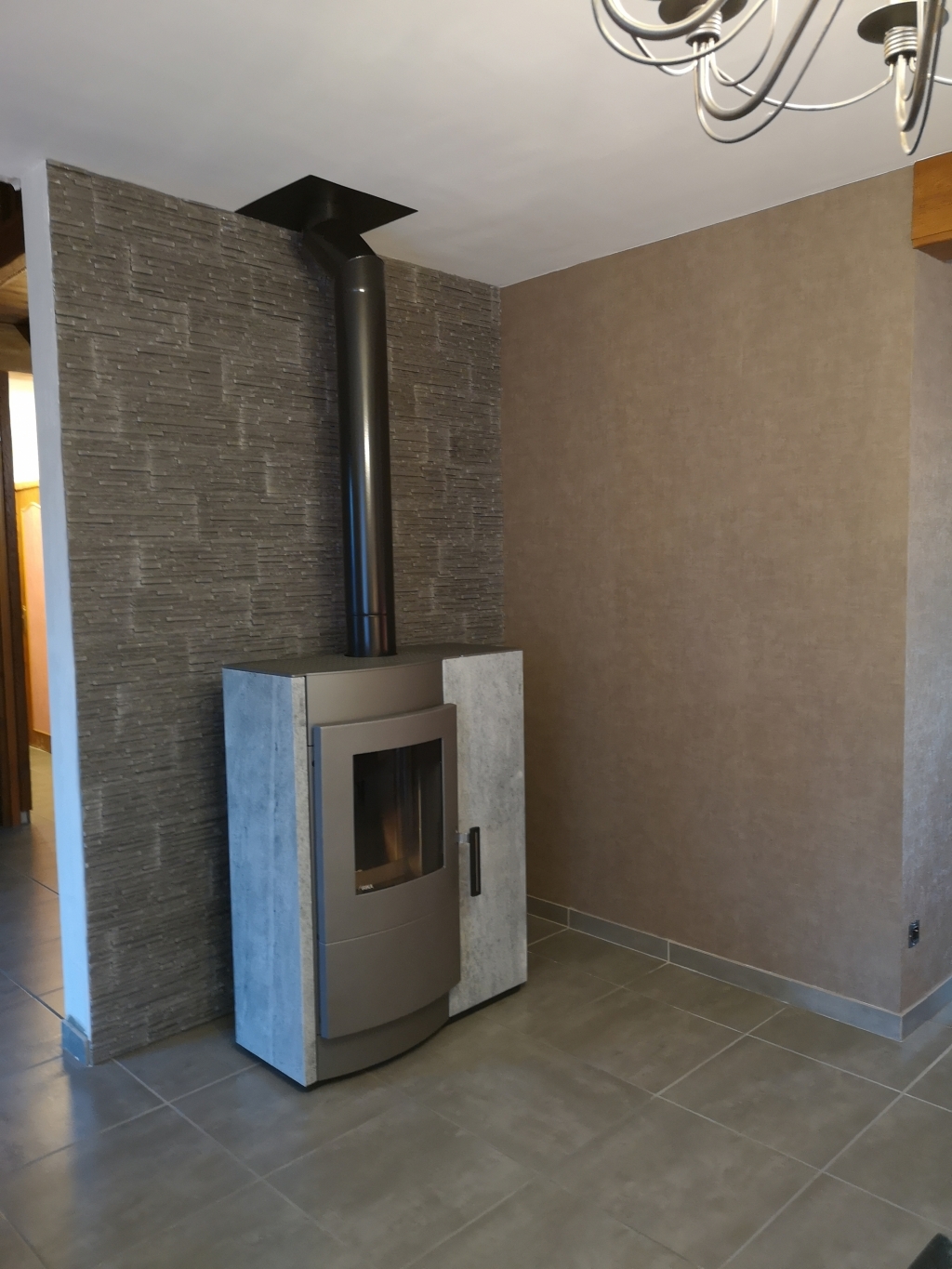Installation d'un poêle mixte (granulés de bois et bûches) RIKA modèle Induo II avec création d'un conduit.