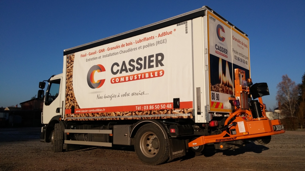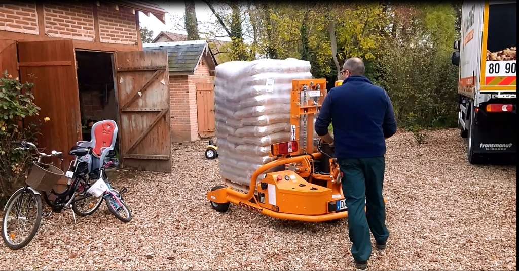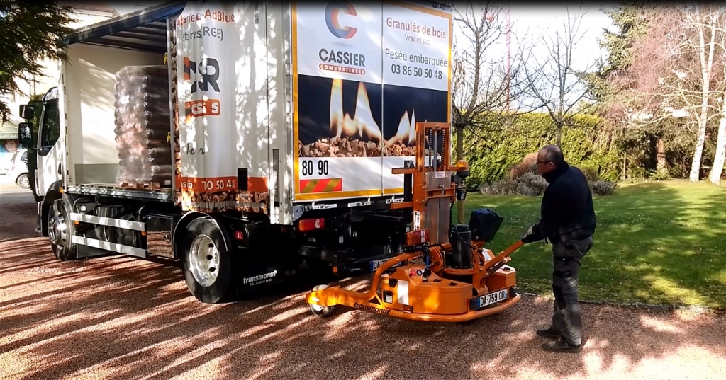 Livraison de granulés de bois en sac avec notre camion équipé d'un chariot électrique embarqué à Cercy la Tour.