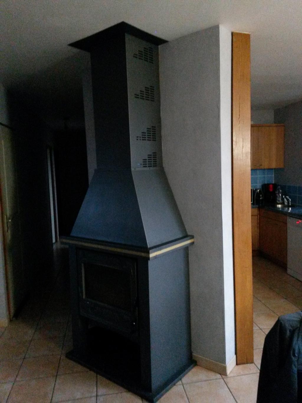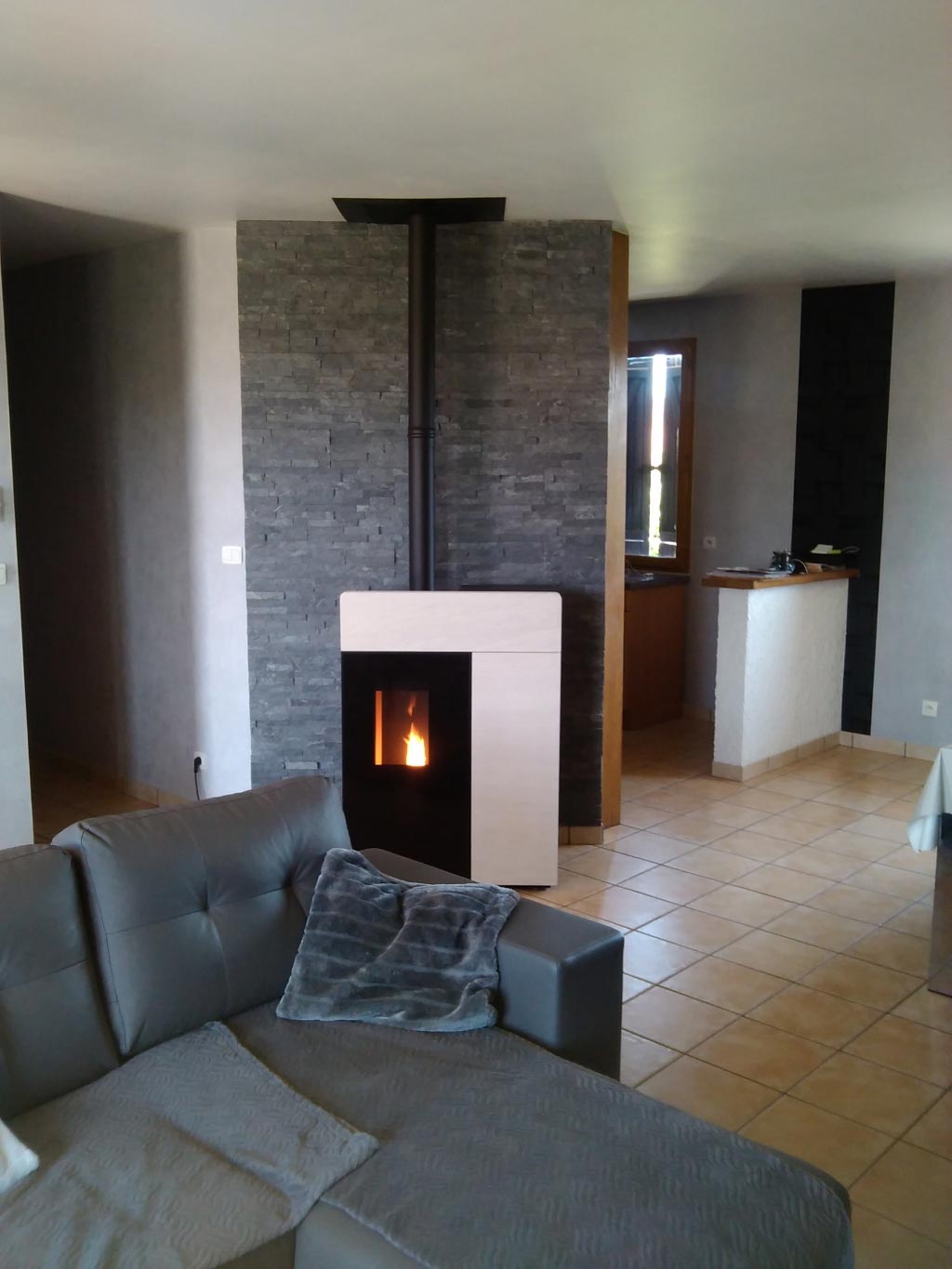 Installation d'un poêle à granulés de bois de marque RIKA modèle Domo puissance max 10 kW corps noir Pierre blanche en remplacement d'un poêle à bois