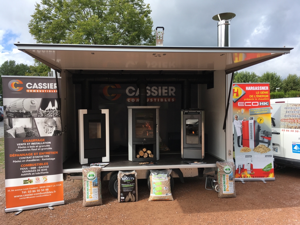 Notre showroom mobile à découvrir lors de nos salons et foires dans la Nièvre (58) et l'Allier (03) avec présentation de nos gammes de poêles Rika et Thermorossi et nos marques de granulés Biosyl, Moulin Bois Energie, Wohl und Warm et 3 Bois.