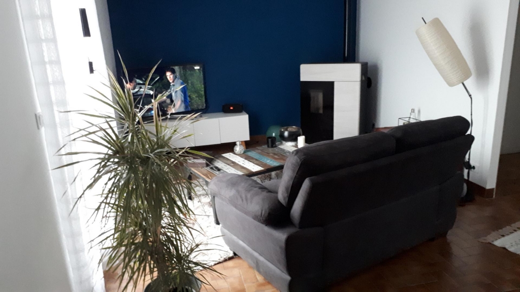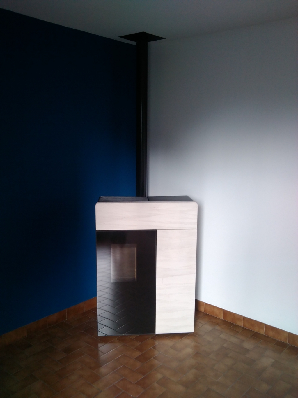 Installation d'un poêle à granulés de bois RIKA modèle Domo, habillage Pierre Blanche du Portugal