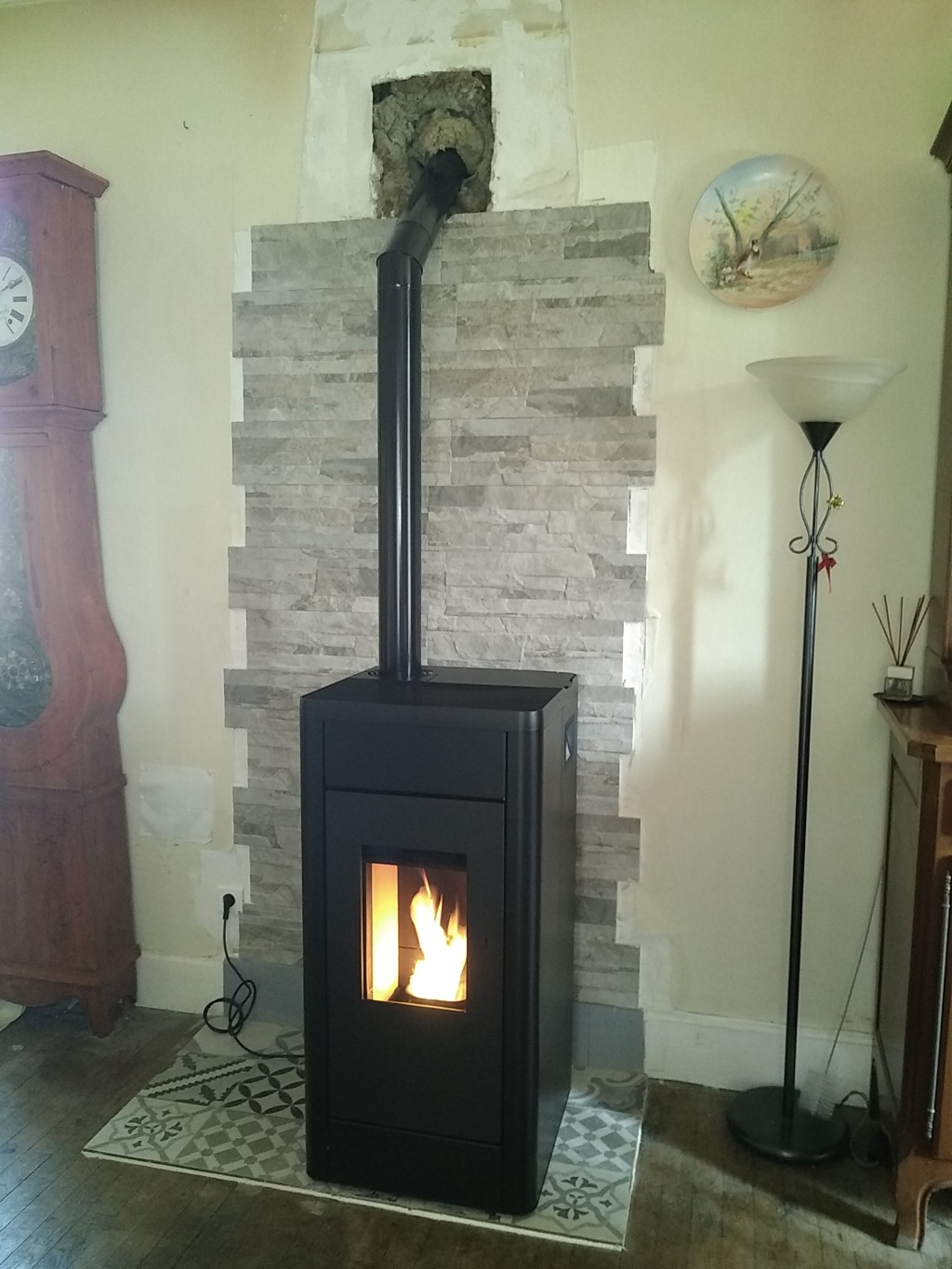 Installation d'un poêle à granulés de bois RIKA, modèle Filo.