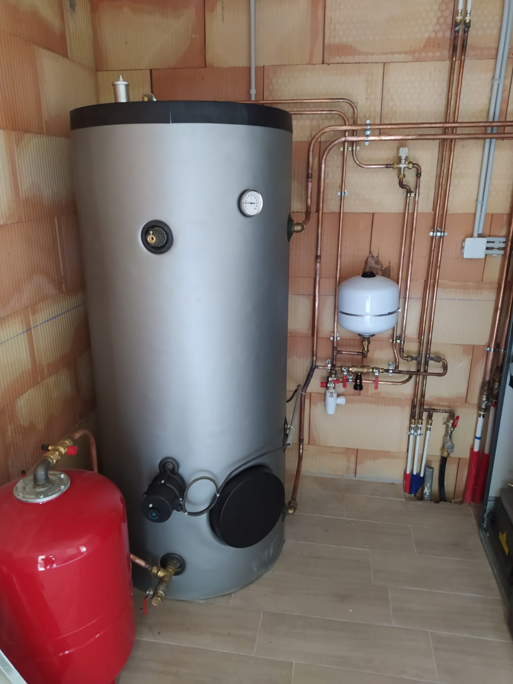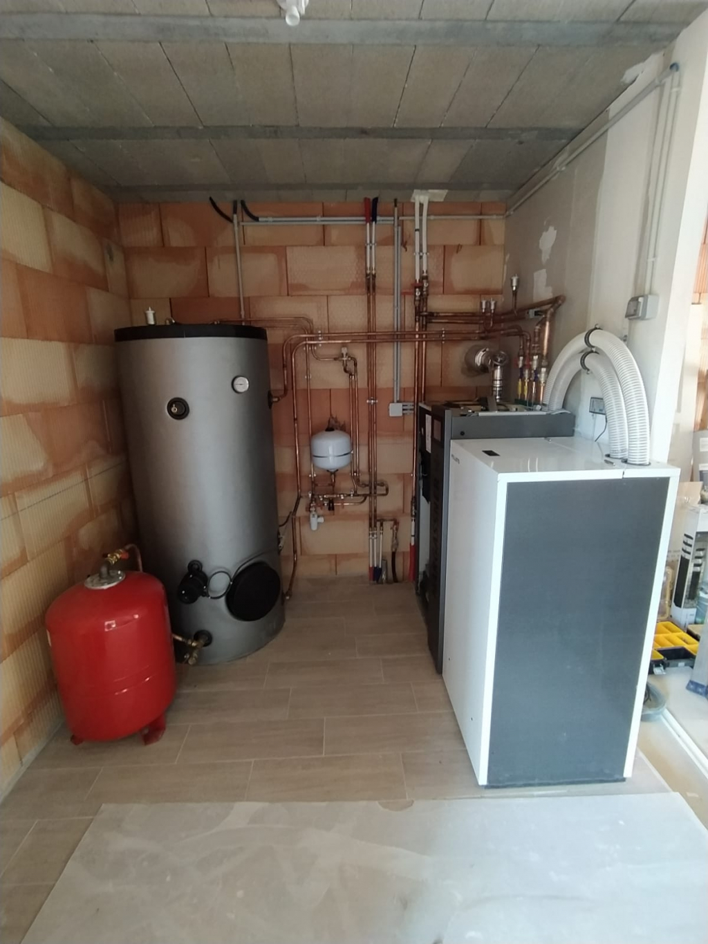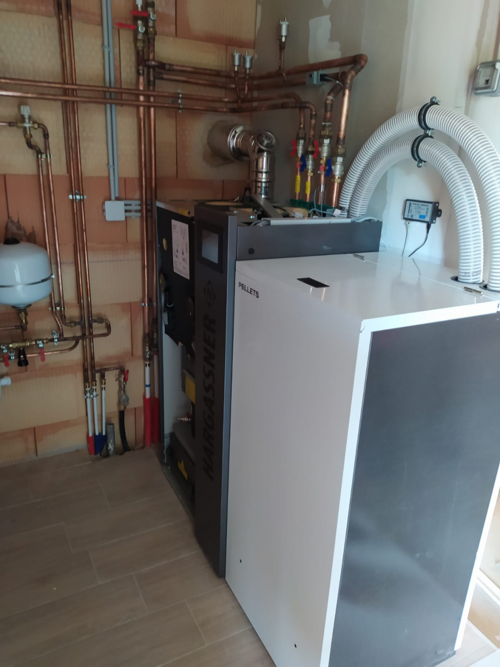 Installation d'une chaudière à granulés de bois HARGASSNER, modèle Nano PK6 d'une puissance de 6 kW avec son silo de stockage et ballon ECS de 600 litres