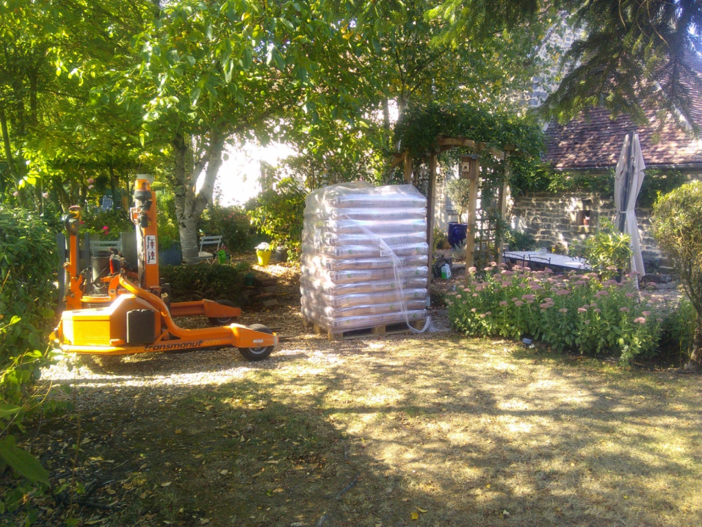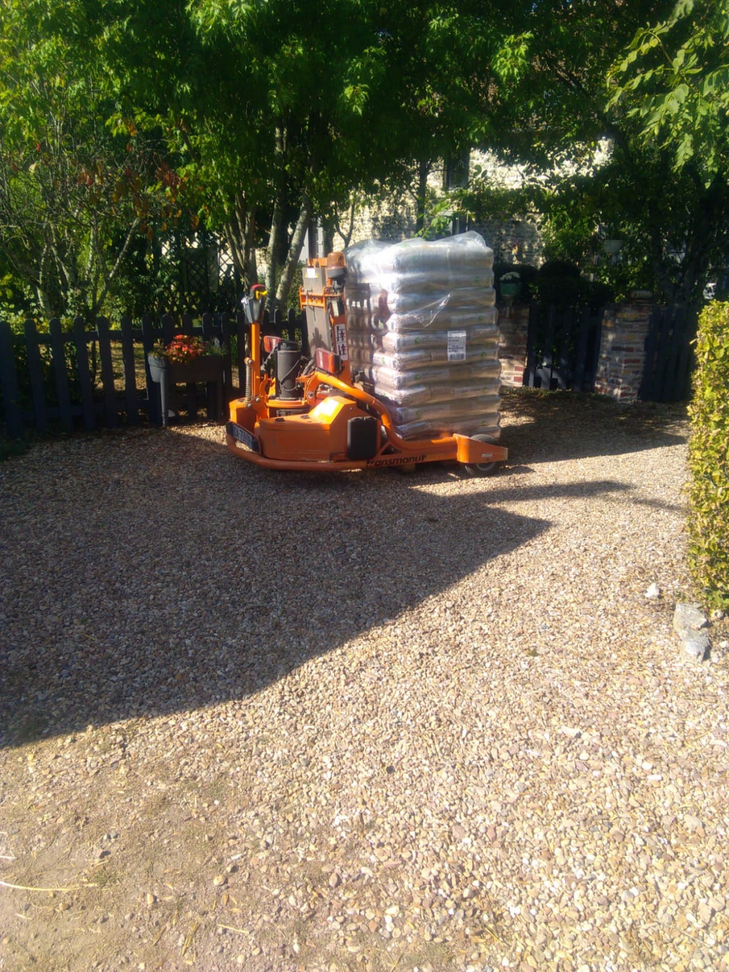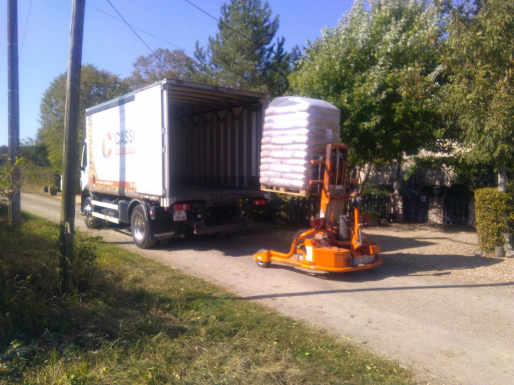 Livraison de granulés de bois en sac avec notre camion équipé d'un chariot électrique embarqué