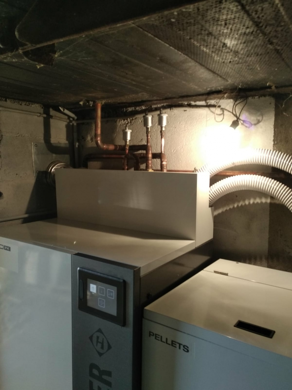 Installation d'une chaudière à granulés de bois HARGASSNER, modèle Nano PK 12 d'une puissance de 12 kW avec son nano silo de stockage d'une capacité de 220 kg en remplacement d'une chaudière fioul hors condensation