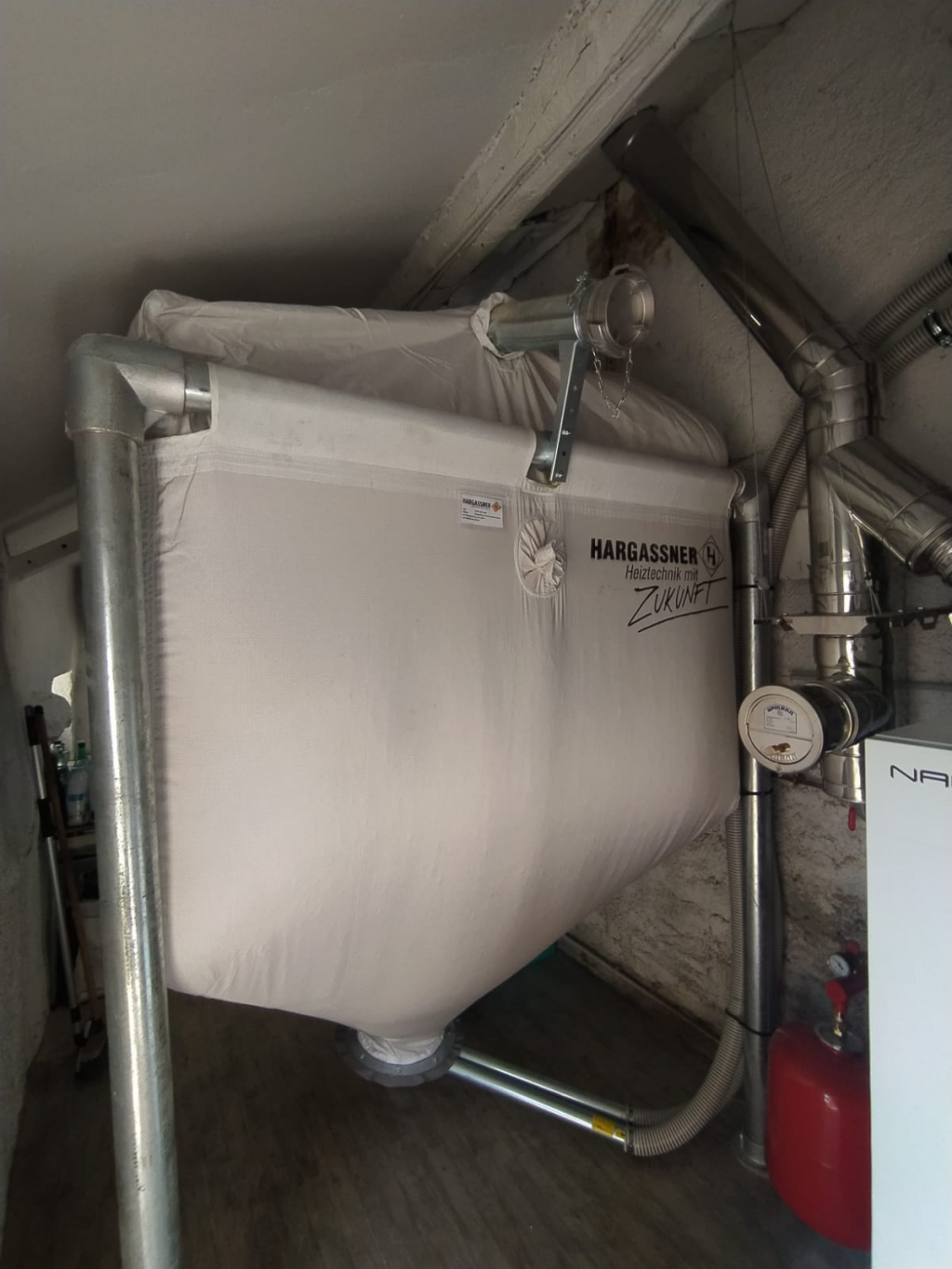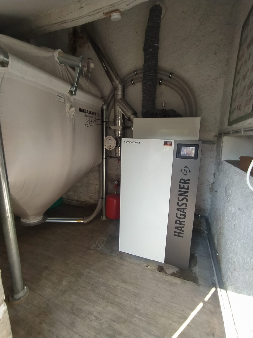 Installation d'une chaudière à granulés de bois HARGASSNER, modèle Nano PK15 d'une puissance de 15 kW , avec son silo de stockage d'une capacité maximale de 2,5 Tonnes en remplacement d'une chaudière fioul hors condensation avec neutralisation de la cuve à fioul existante.