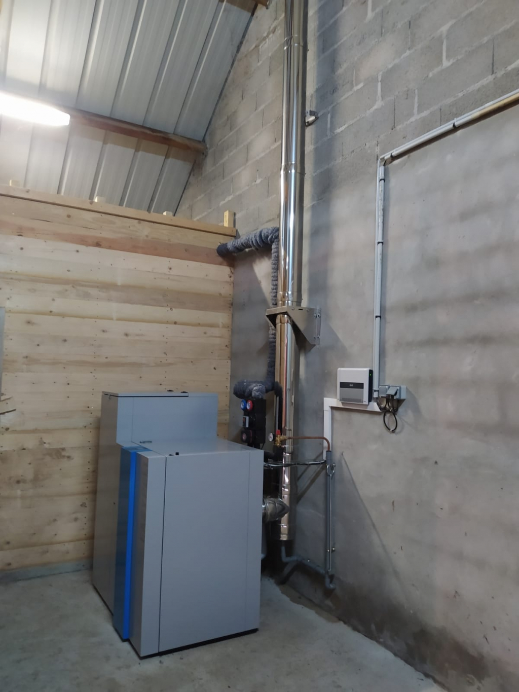 Installation d'une chaudière à granulés de bois EASYPELL, d'une puissance de 20 kW , avec son silo de stockage d'une capacité de 165 kg en remplacement d'une chaudière fioul hors condensation.