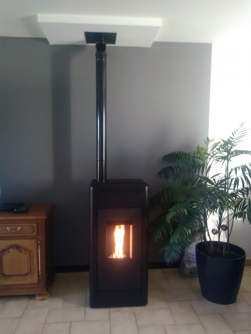 Installation d'un poêle à granulés de bois RIKA avec sortie sur le dessus, modèle Filo avec gainage du conduit existant
