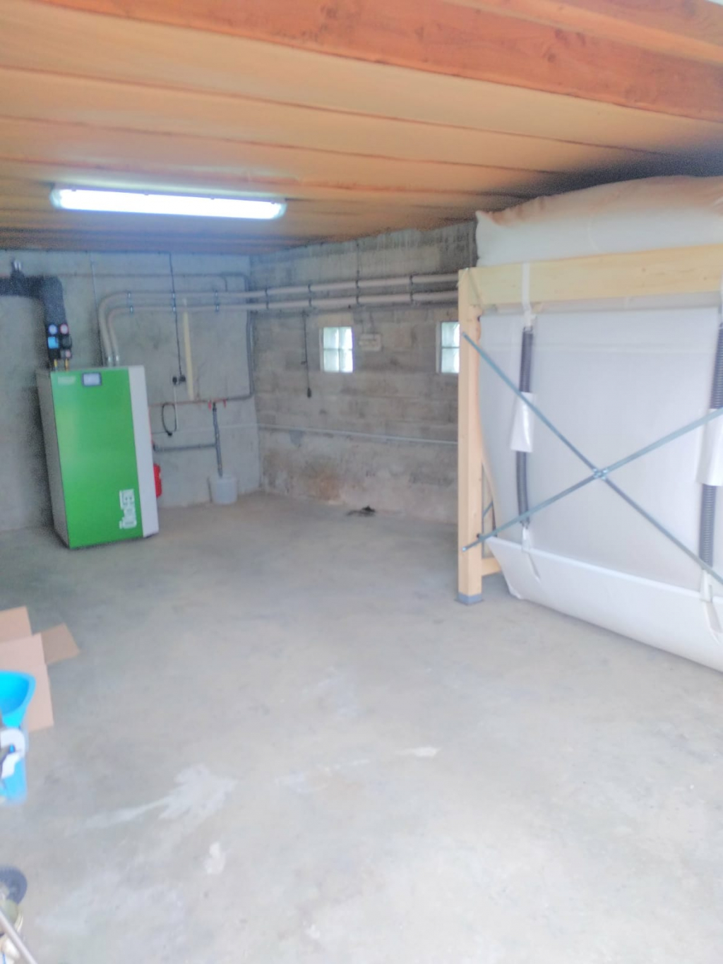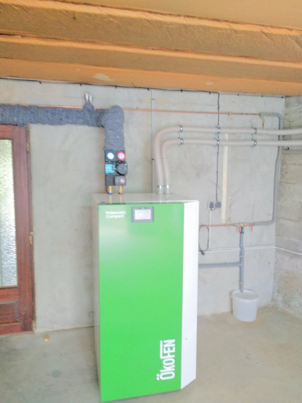 Installation d'une chaudière à granulés de bois ÖkoFEN, modèle Pellematic Compact d'une puissance de 14 kW avec son silo de stockage d'une capacité d'environ 4,2 tonnes en remplacement d'une chaudière fioul hors condensation et dépose de l'ancienne cuve à fioul existante
