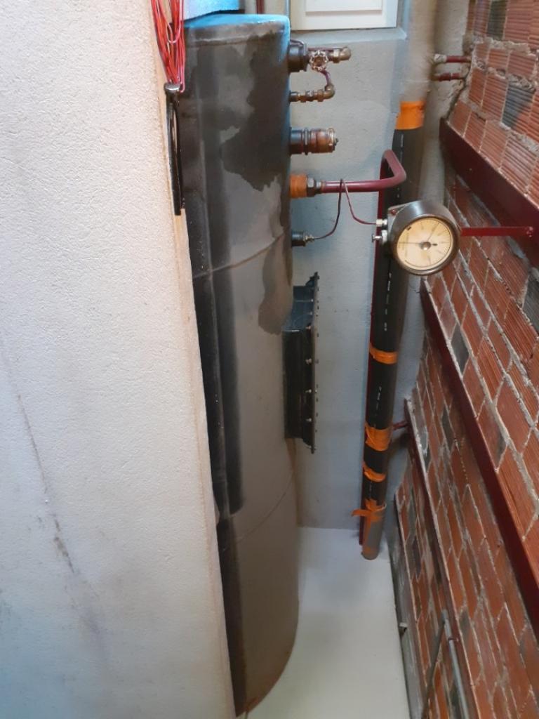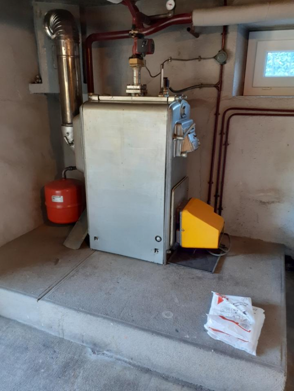 Installation d'une chaudière à granulés de bois ÖkoFEN, modèle Pellematic Compact d'une puissance de 18 kW avec son silo de stockage d'une capacité d'environ 2 tonnes en remplacement d'une chaudière fioul hors condensation et dépose de l'ancienne cuve à fioul existante.