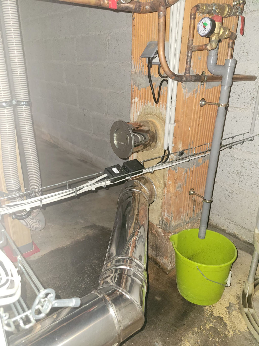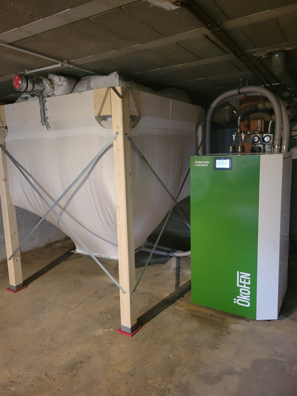 Installation d'une chaudière à granulés de bois ÖkoFEN, modèle Pellematic Compact d'une puissance de 12 kW avec son silo de stockage d'une capacité d'environ 3 tonnes en remplacement d'une chaudière fioul hors condensation et dépose de l'ancienne cuve à fioul existante.