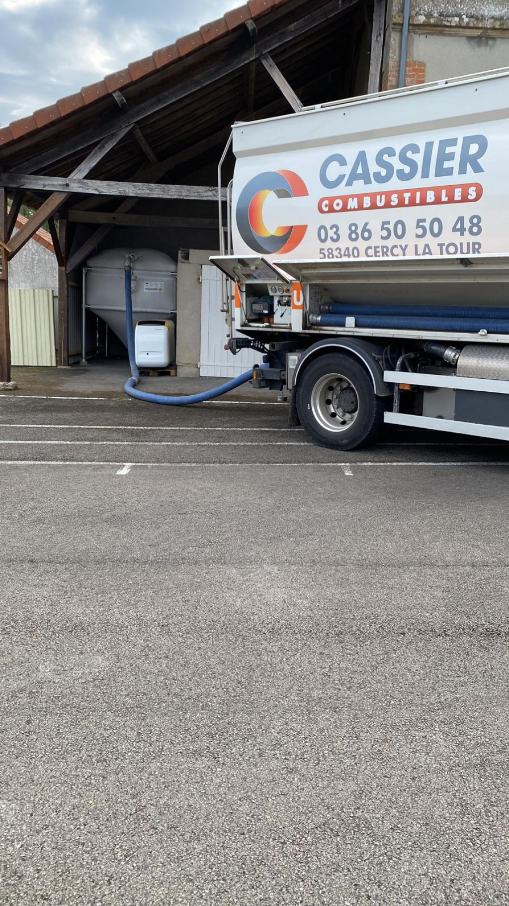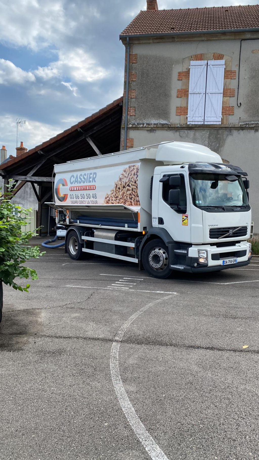 Dans la région de Nevers, livraison de granulés de bois (pellets) en vrac dans un silo textile avec notre camion souffleur muni d'une pesée embarquée.