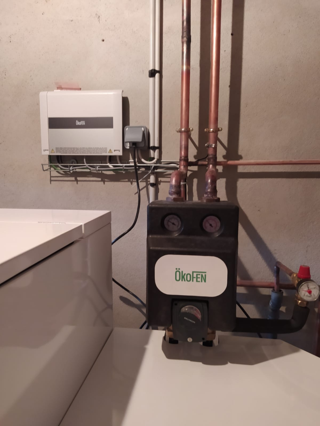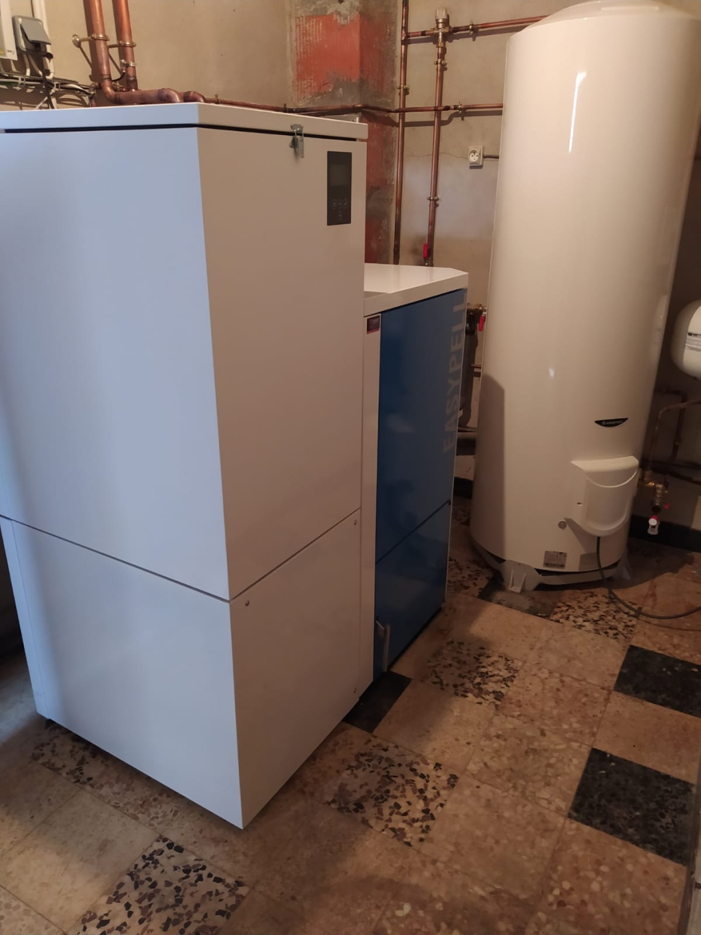 A Moulins-Engilbert, dans la Nièvre, installation d'une chaudière à granulés de bois/pellets Easypell sous licence ÖkoFEN, d'une puissance de 16 kW avec son silo à chargement manuel d'une capacité de 150 kg en remplacement d'une chaudière fioul hors condensation et dépose de l'ancienne cuve à fioul.