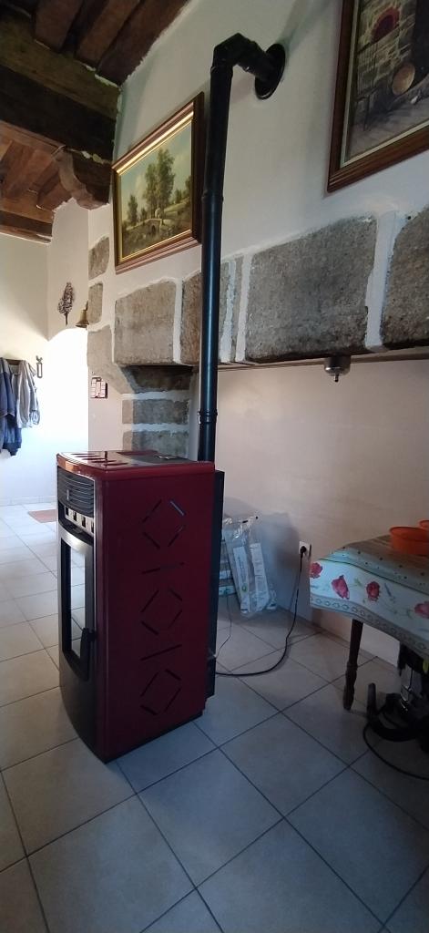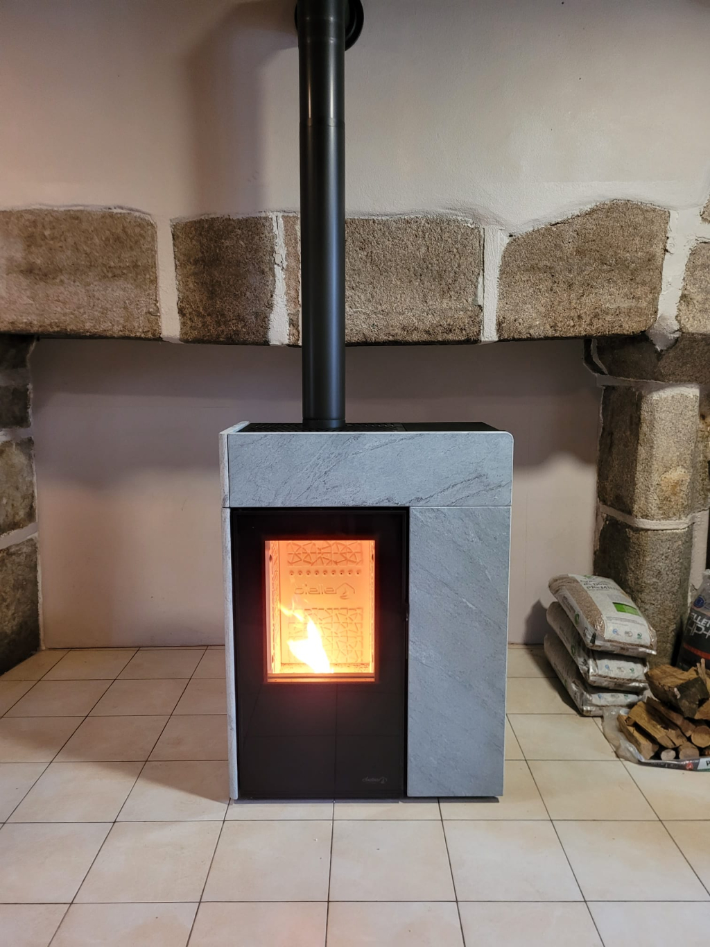 A Larochemillay (58), installation d'un poêle mixte à granulés de bois/pellets et bois bûches. Marque DIELLE, modèle Ghibli Hybrid 80 devant une cheminée existante, en remplacement d'un ancien poêle.