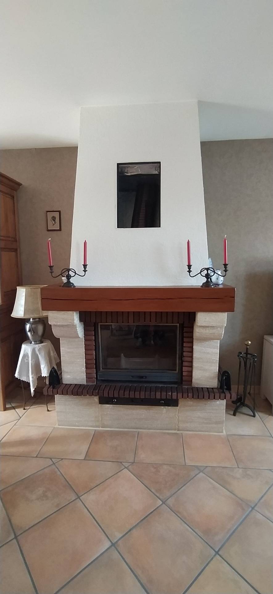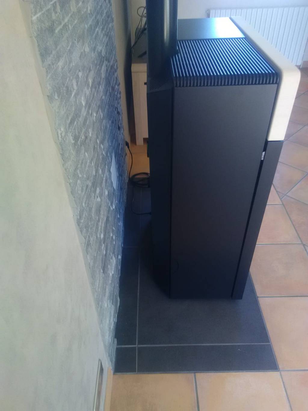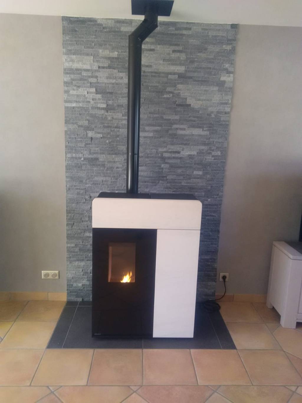 À Chatillon-en-Bazois dans la Nièvre (58), installation d'un poêle à granulés de bois/pellets RIKA, modèle Domo, d'une puissance de 10 kW, sortie sur le dessus en remplacement d'une ancienne cheminée.
