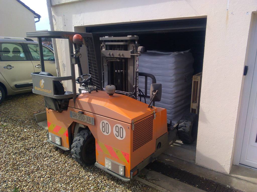Livraison à Cercy la Tour, dans la Nièvre (58), d'une palette de granulés de bois / pellets en sacs avec notre camion équipé d'un chariot embarqué (palette que l'on dépose au plus près du lieu de stockage ou dans le lieu de stockage si accessible).