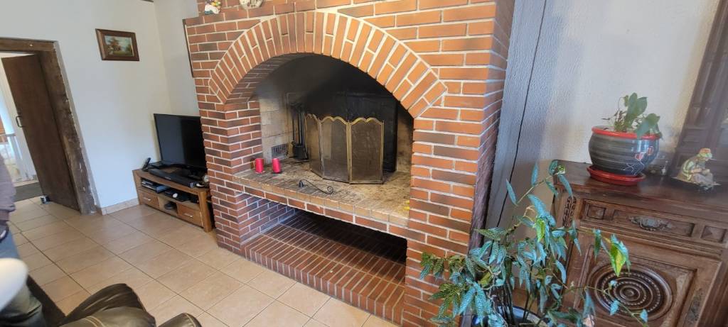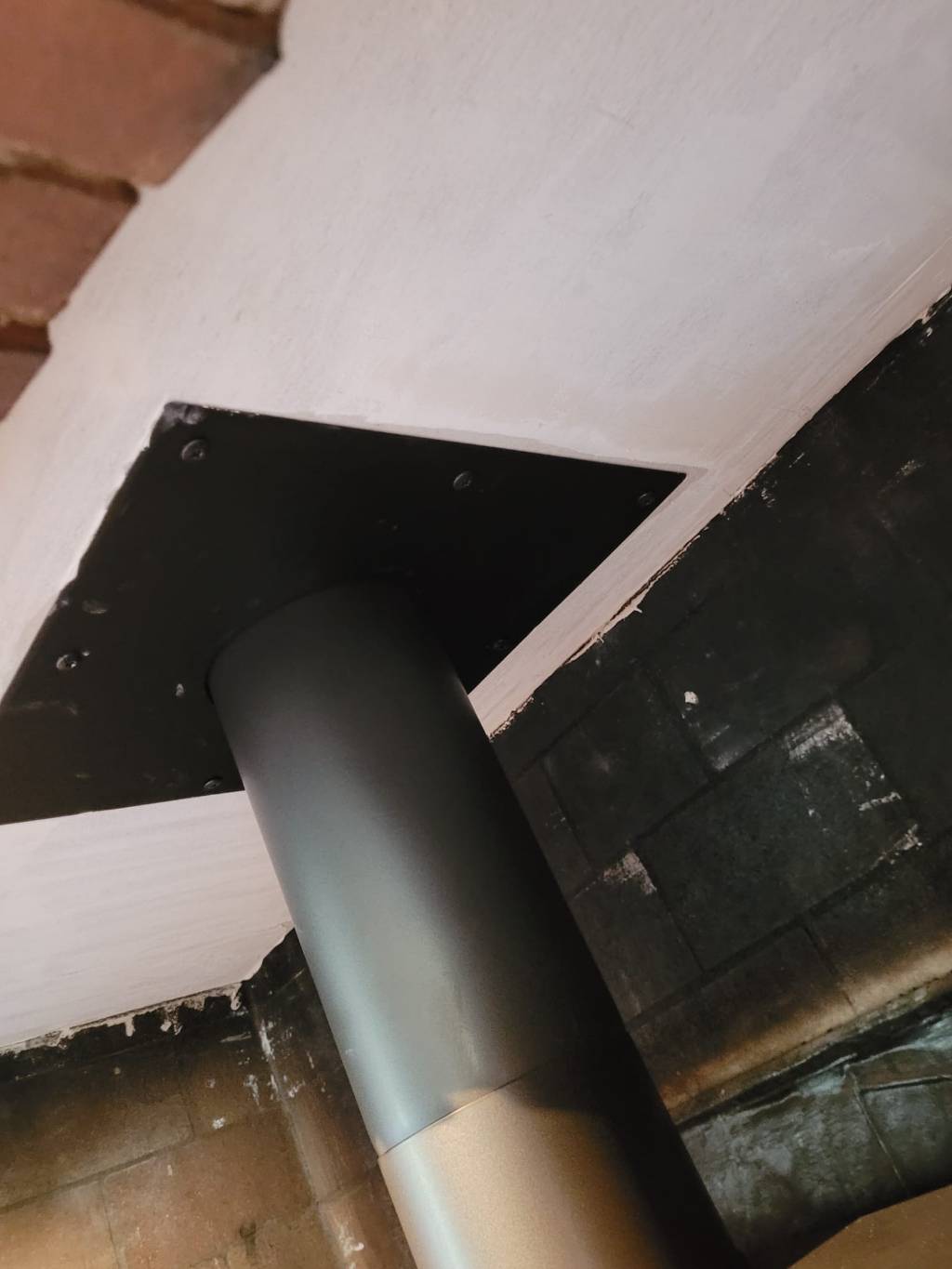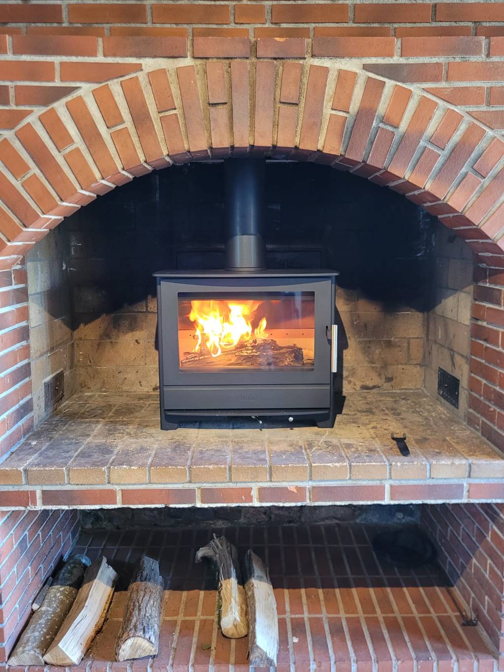 À Toury-Lurcy, dans la Nièvre (58), installation dans une cheminée d'un poêle à bois bûches HETA, modèle Inspire 55 d'une puissance de 6 kW en sortie sur le dessus.