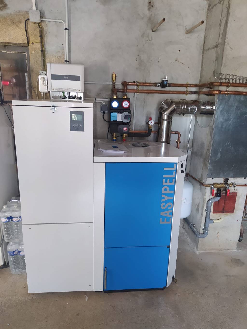 À Sémelay dans la Nièvre (58), mise en œuvre d'une chaudière à granulés de bois / pellets Easypell d'une puissance de 12 kW avec son silo de stockage à chargement manuel d'une capacité de 150 kg en remplacement de la chaudière fioul existante.
