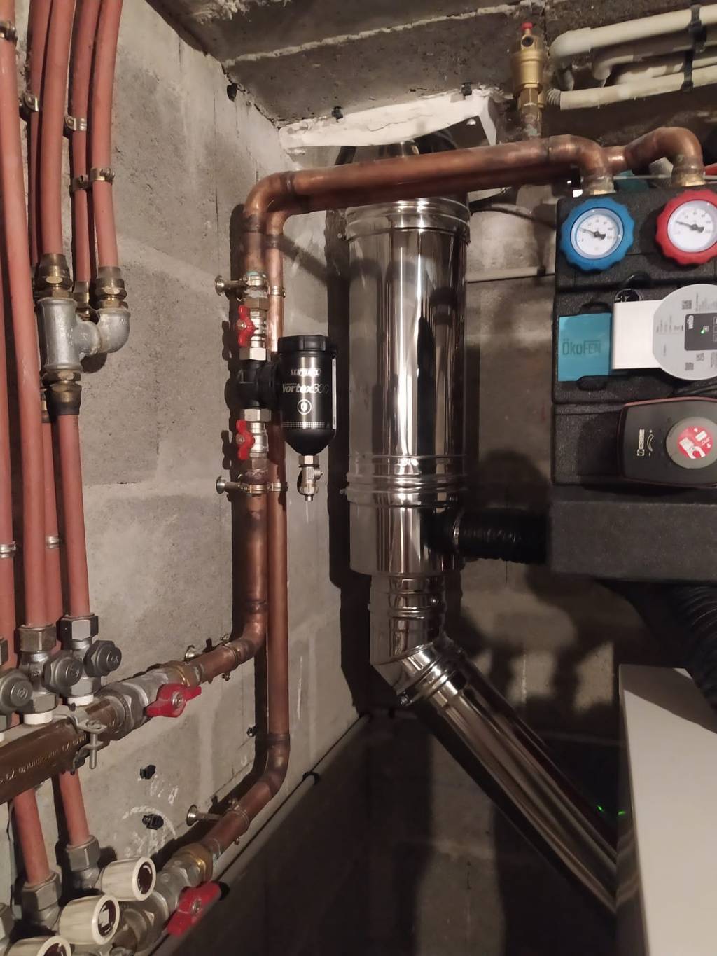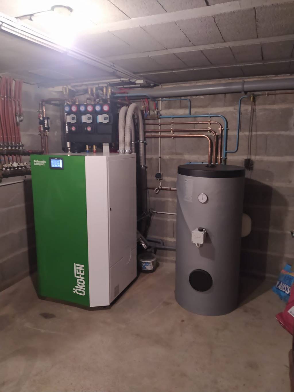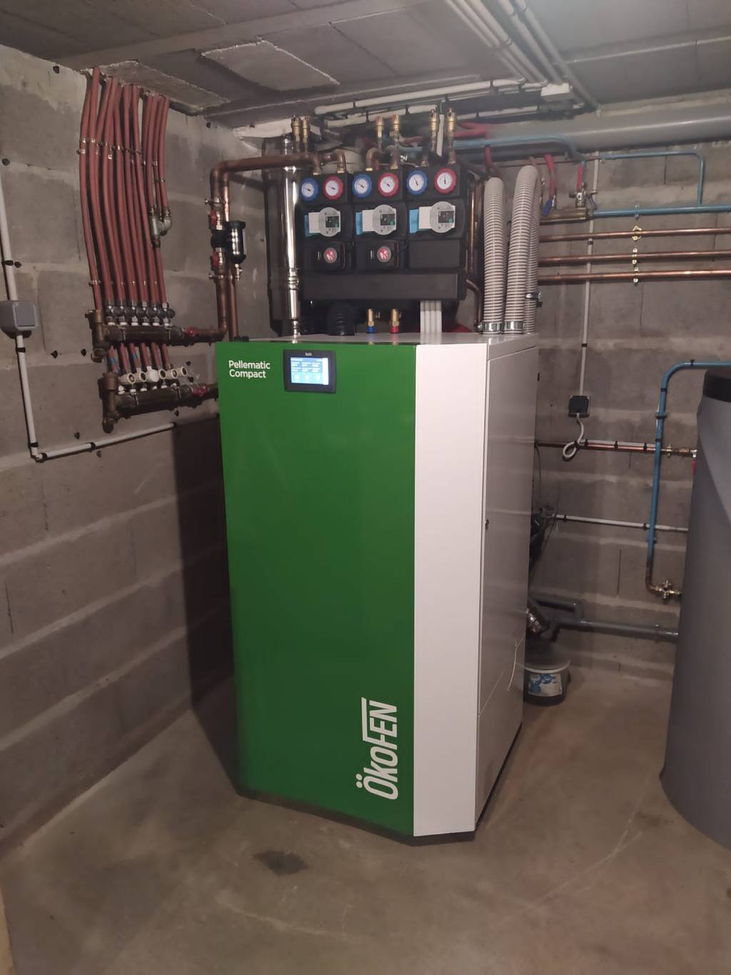 L'installation de la chaudière inclut un réseau plancher chauffant, un réseau de radiateurs, et un réseau ECS avec un ballon ECS de 200 litres bi-énergie.