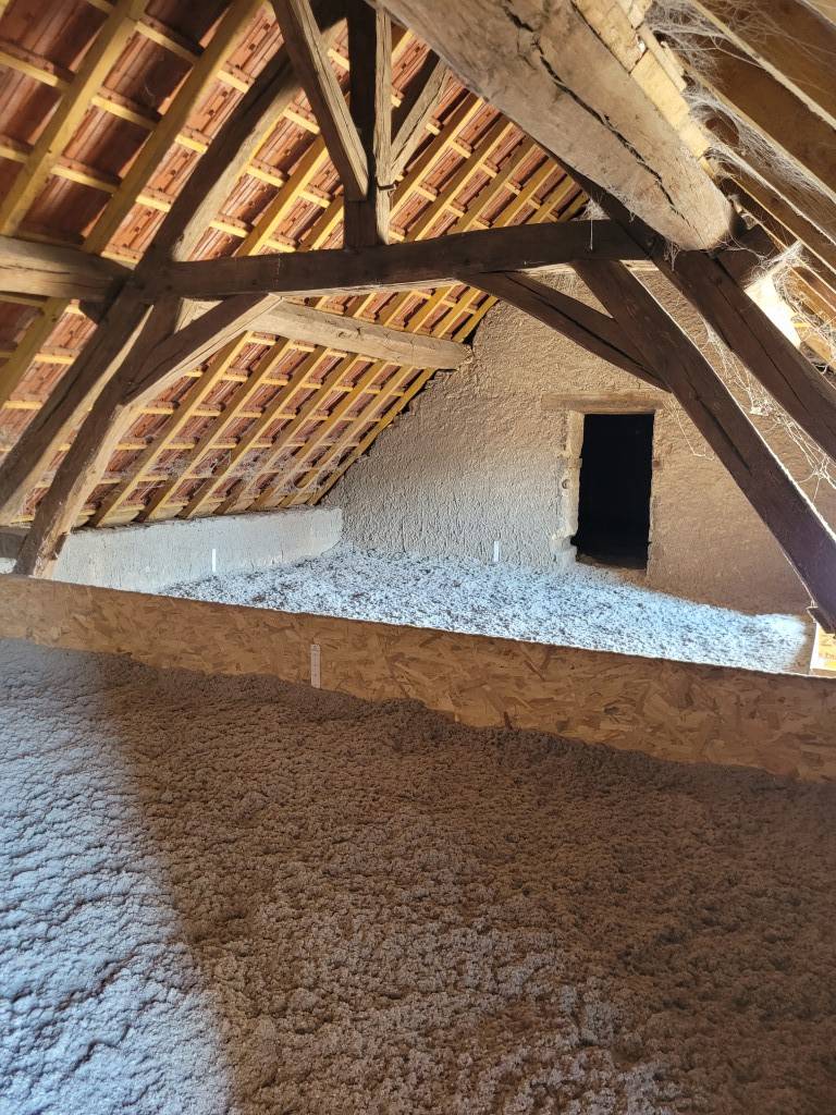 Pour ce chantier d'isolation thermique de combles perdus de 50 m² à Decize, dans la Nièvre (58), nous avons utilisé de la ouate de cellulose (335 mm d'épaisseur) soufflée à l'aide d'une machine.