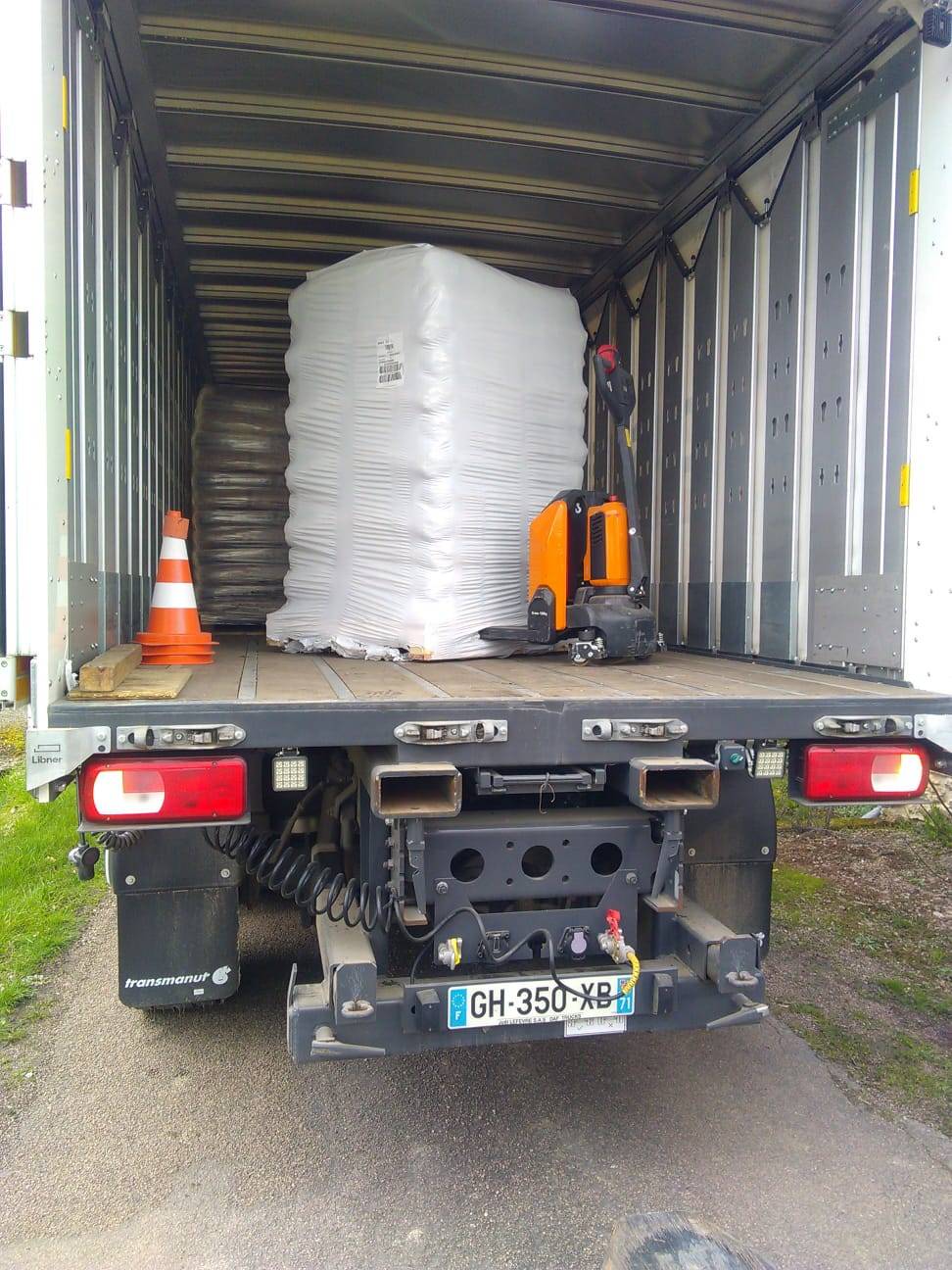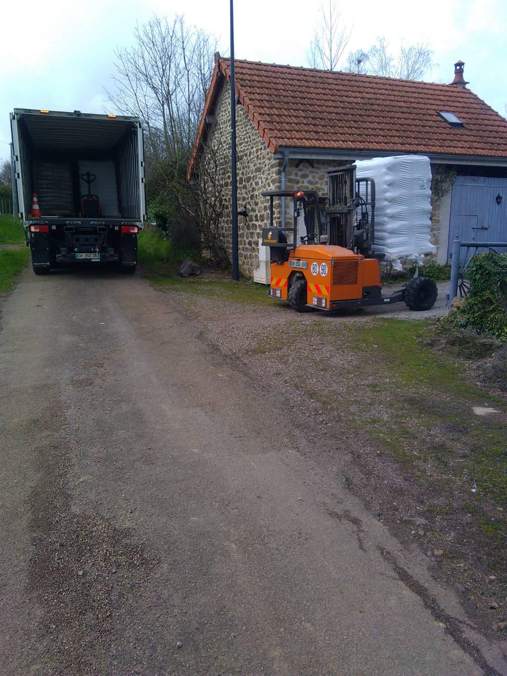 Livraison à Fertrève, dans la Nièvre (58), d'une palette de granulés de bois / pellets en sacs avec notre camion équipé d'un chariot embarqué (palette que l'on dépose au plus près du lieu de stockage en fonction de son accessibilité).