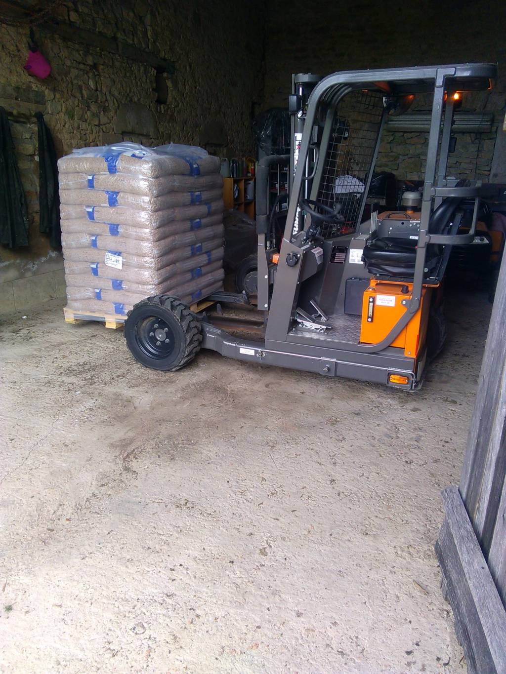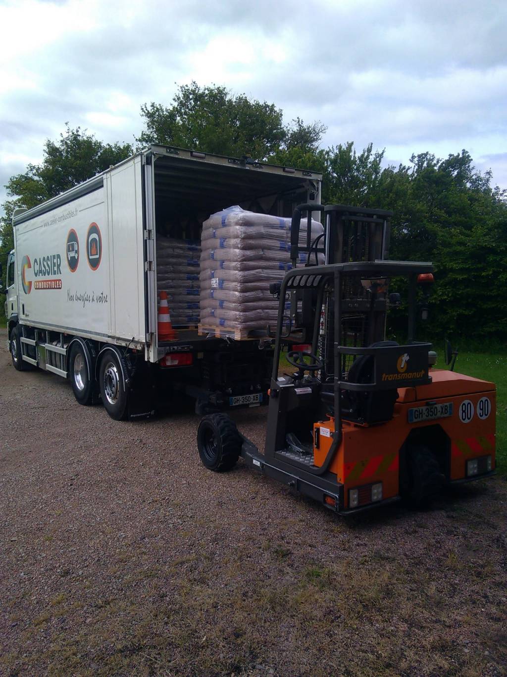 Livraison dans la Nièvre (58), à Rouy, de deux palettes de granulés de bois / pellets en sacs avec notre camion équipé d'un chariot embarqué (palette que l'on dépose dans le lieu de stockage ou au plus près en fonction de son accessibilité).