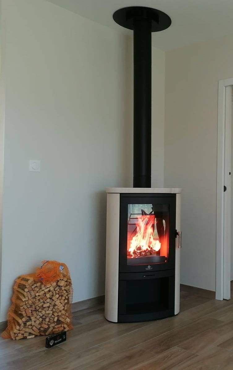 À Cercy la Tour, dans la Nièvre (58), pose d'un poêle à bois bûches de marque Max Blank, modèle Rio S Stone.