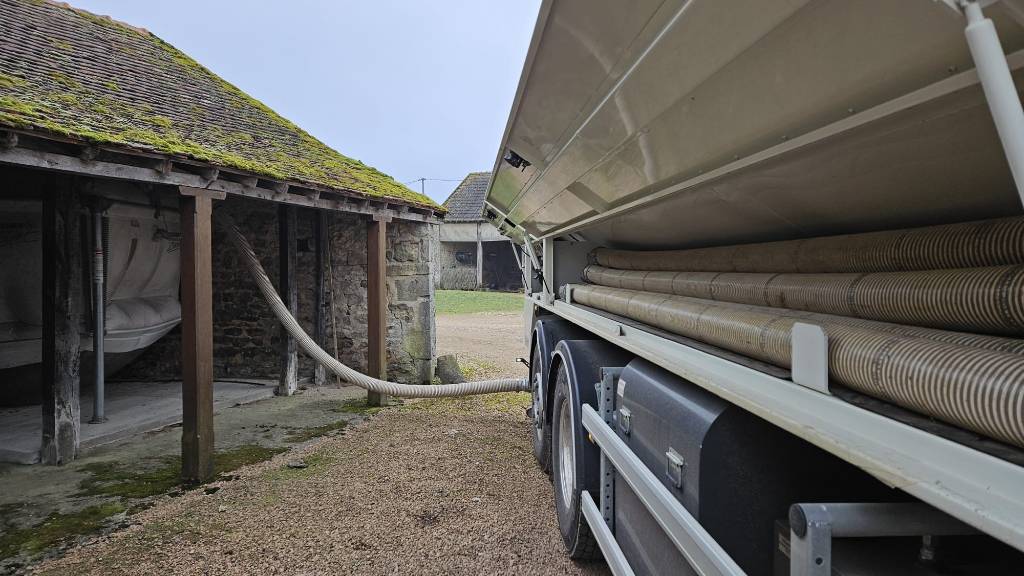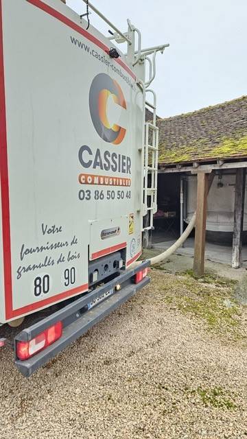 Approvisionnement avec notre camion souffleur muni d'une pesée embarquée et d'un aspirateur de fines pour une Chaufferie Hargassner située à Fertrève entre Décize et Châtillon-en-Bazois dans la Nièvre (58).