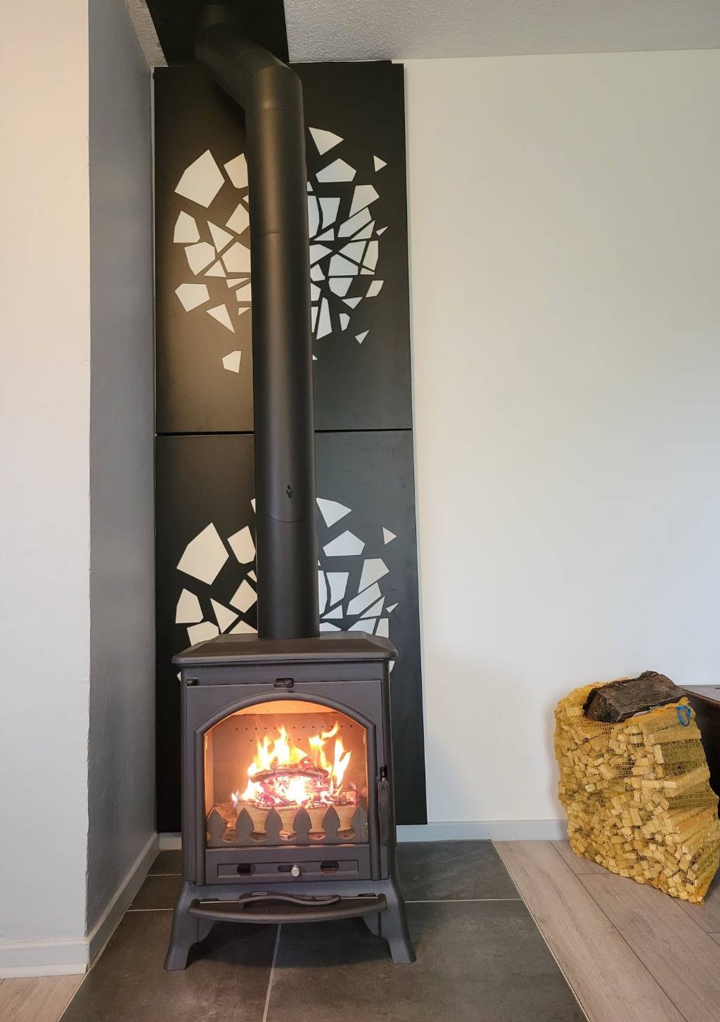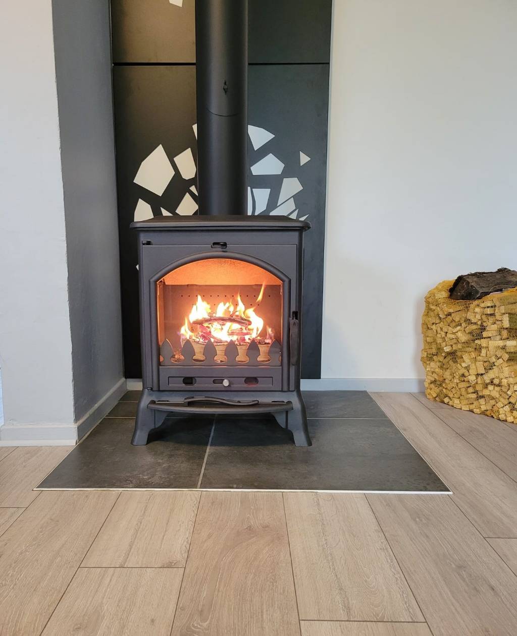 Installation d'un poêle à bois bûches de marque LAUDEVCO, modèle BO9 Ordessa avec prise d'air indirect.