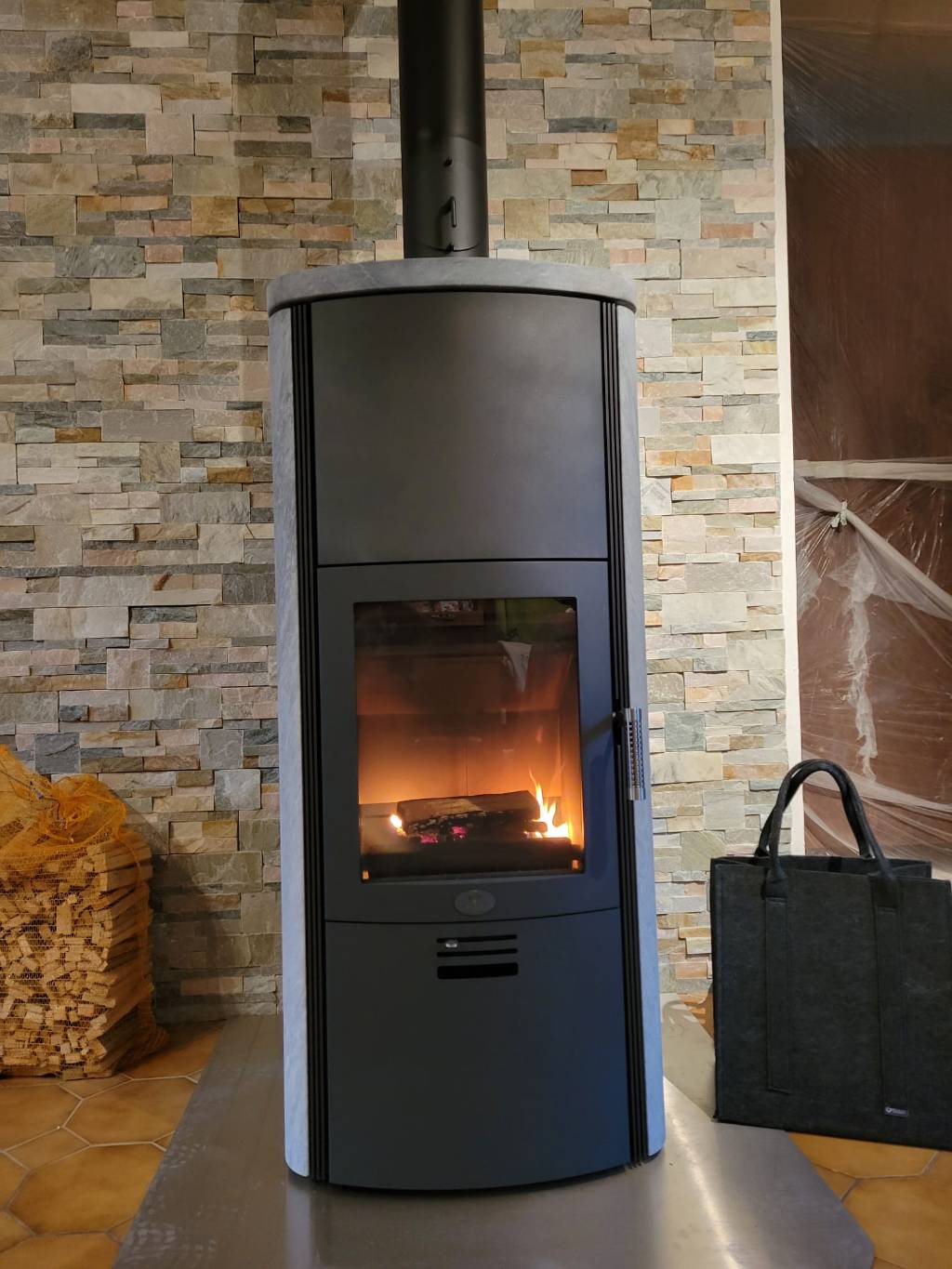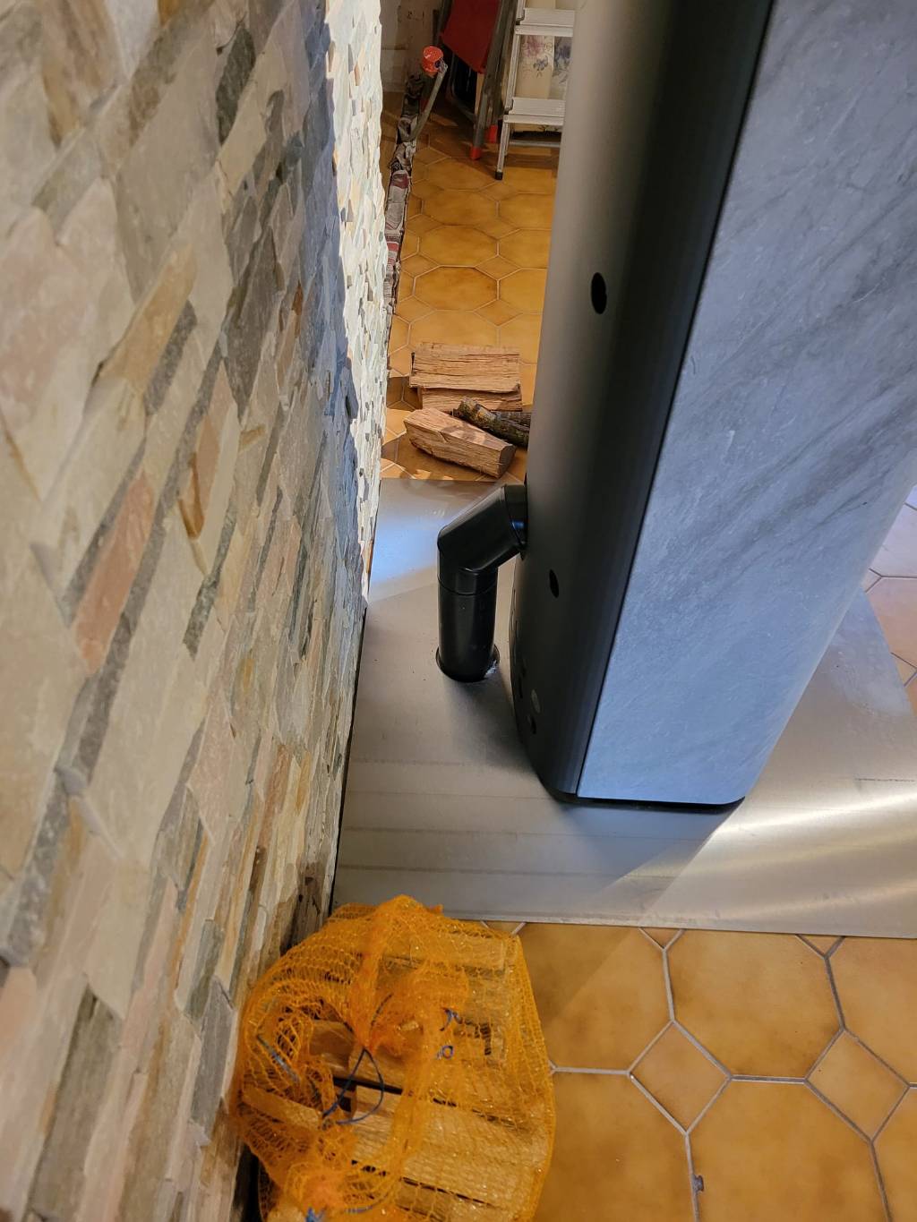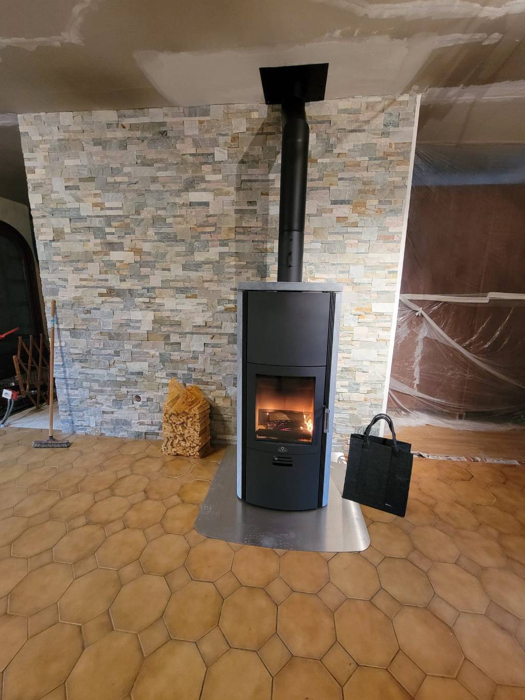À Avril sur Loire, dans la Nièvre (58), installation d'un poêle à bois bûches de marque Max Blank modèle Toulouse SP pierre gris bleu sablé en remplacement d'un poêle à bois. Ce poêle est un modèle à accumulation permettant de prolonger la chaleur dans la maison