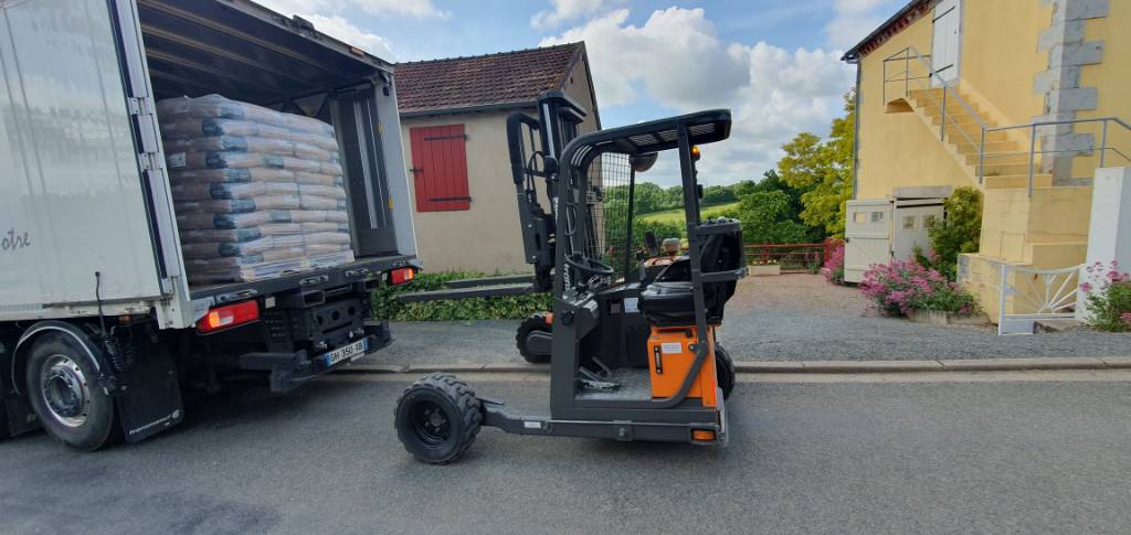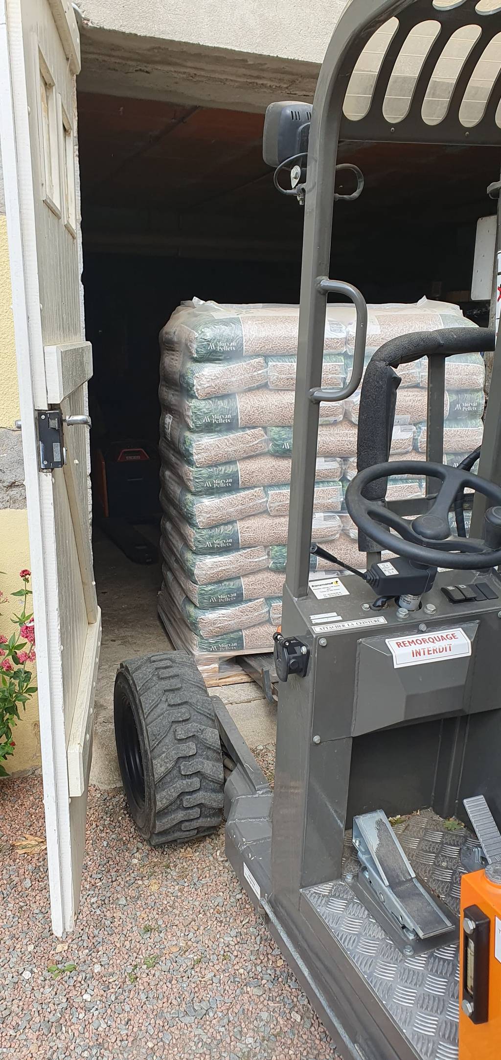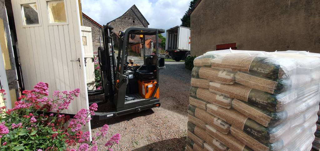 Cette livraison a été effectuée avec notre camion équipé d'un chariot embarqué (palette que l'on dépose dans le lieu de stockage ou au plus près en fonction de son accessibilité). Granulés de bois 100 % résineux fabriqués dans le Morvan à La Roche-en-Brenil.