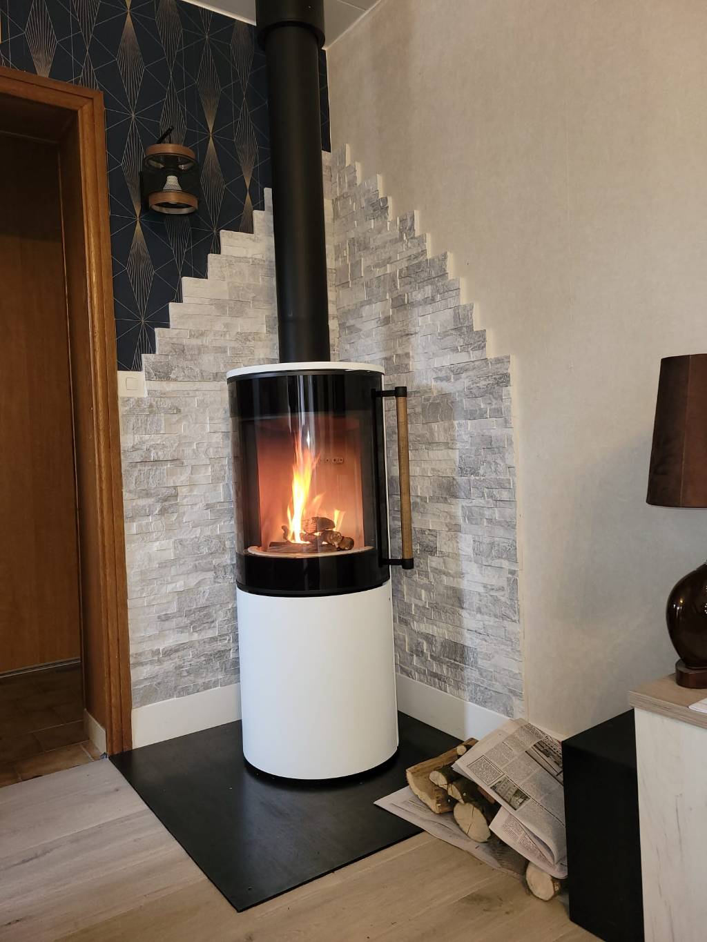 L’appareil repose sur une plaque de sol conforme aux normes de sécurité, et le mur de fond a été habillé d’une pierre de parement décorative, posée au préalable par le client.
