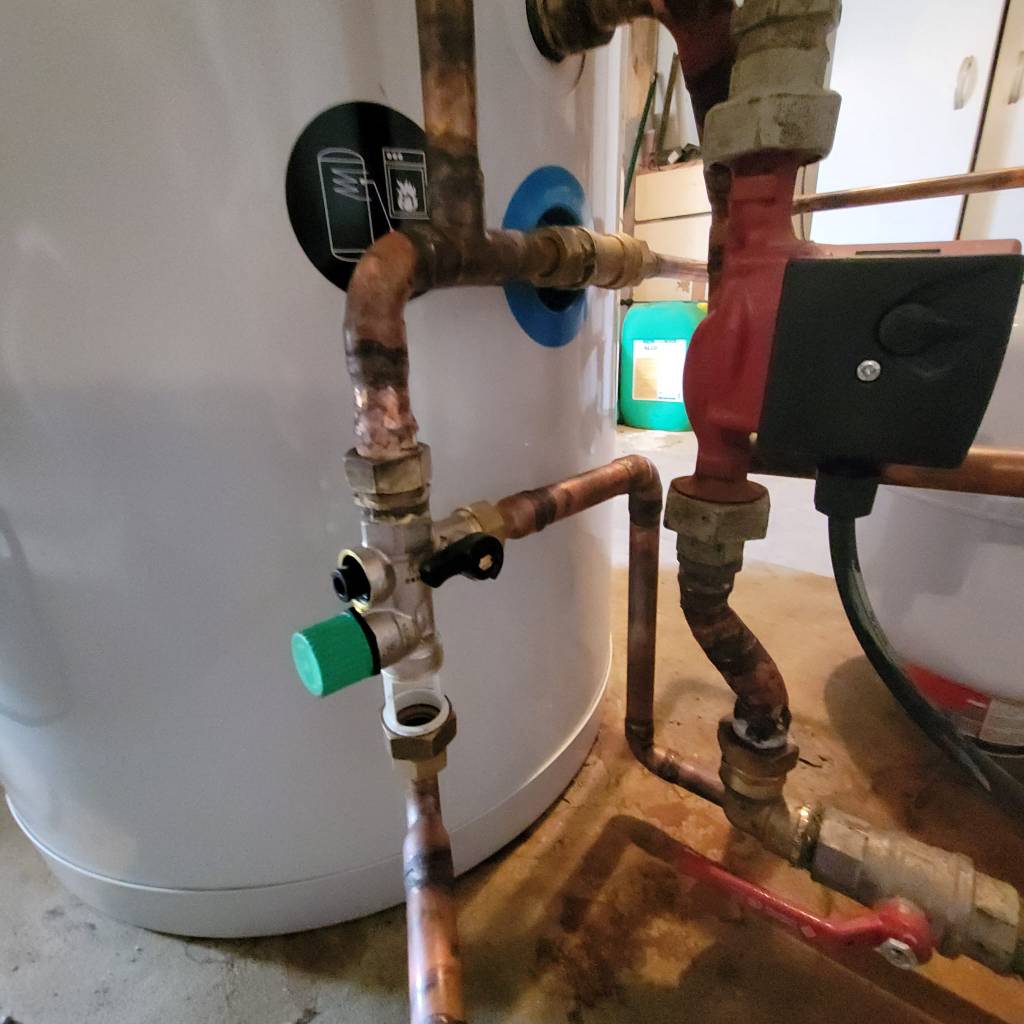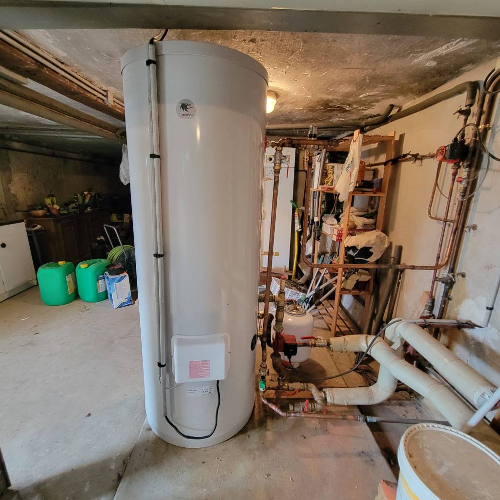 Remplacement de deux ballons d’eau chaude sanitaire de 200 litres chacun, montés sur trépieds, par un ballon ECS Thermor 300 litres.
