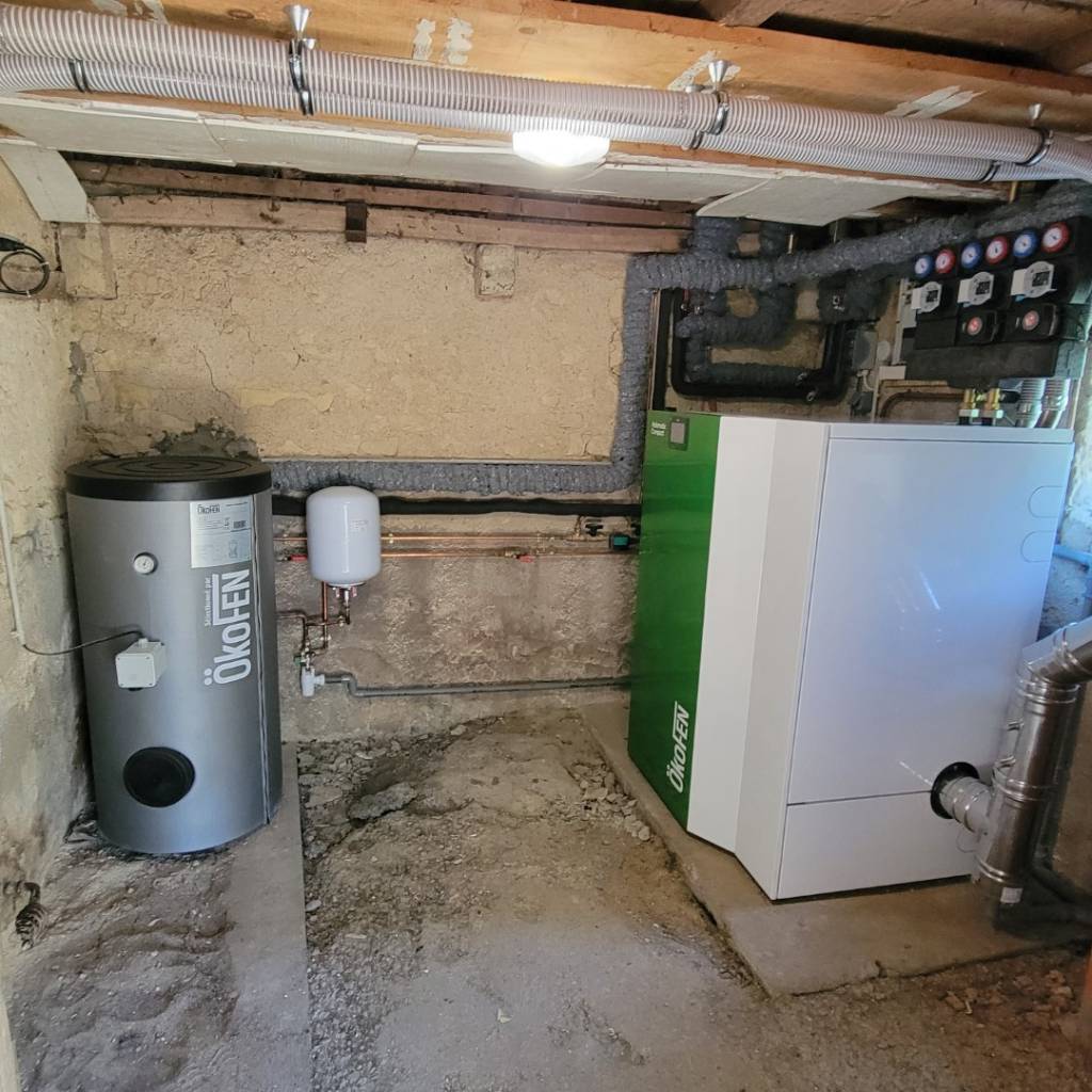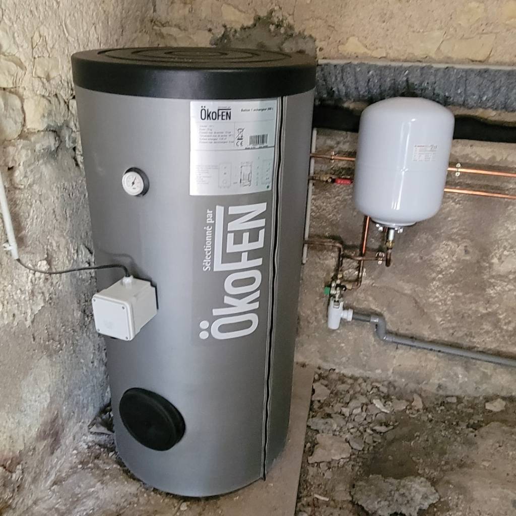 - Installation d’un ballon ECS (Eau Chaude Sanitaire) de 200 litres de marque Ökofen, couplé à la chaudière.