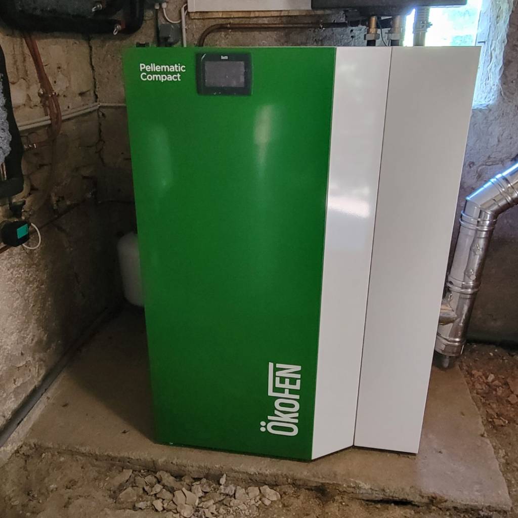 - Remplacement d’une chaudière fioul existante par une chaudière à granulés de bois Ökofen Pellematic Compact 22 kW.