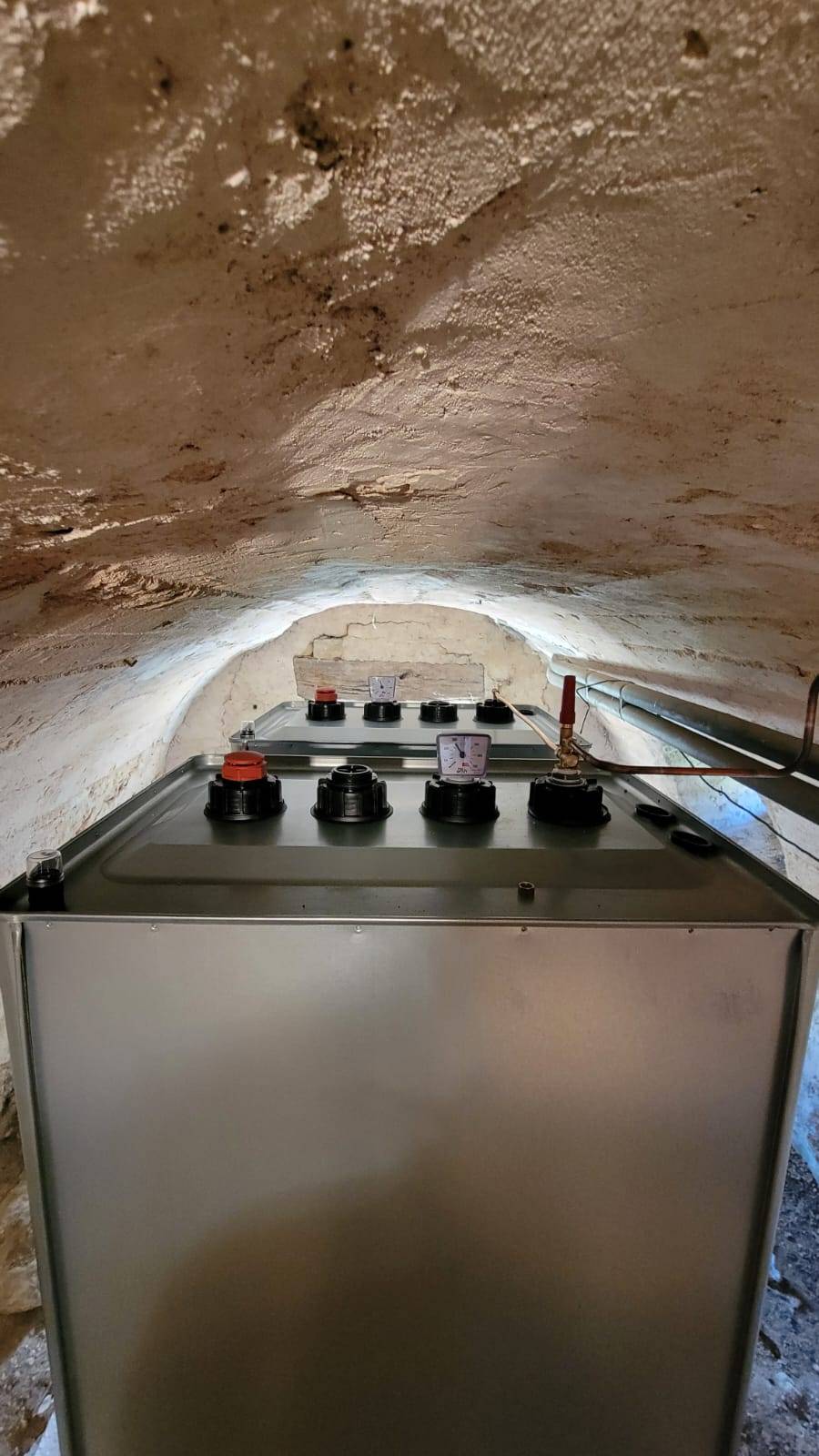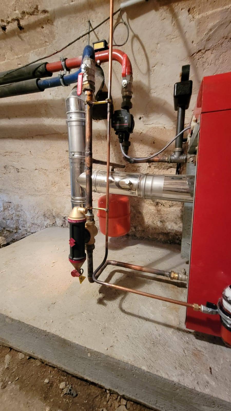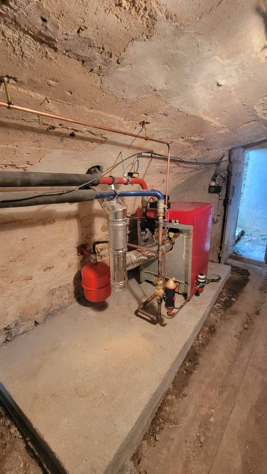 - Mise en place stockage fioul : installation de deux cuves de 1000 litres chacune, raccordées en cuivre avec pot fioul.