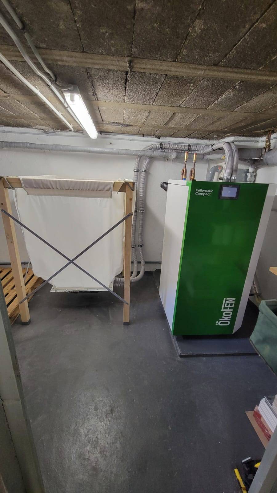 Installation d’une chaudière à granulés Ökofen Pellematic Compact 12 kW équipée d’un silo à chargement manuel de 650 kg. L’installation comprend également l’ajout d’un filtre magnétique à boues pour la protection du circuit de chauffage et d’un vase d’expansion de 24 litres afin d’assurer la régulation de la pression.