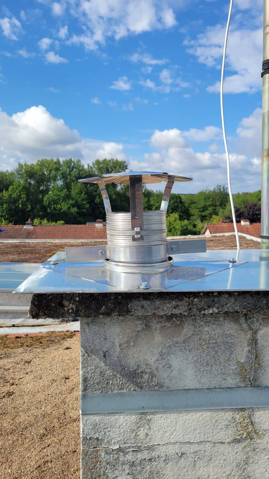 Pour l’évacuation des fumées, un raccordement en simple paroi a été réalisé à l’intérieur de la chaufferie, suivi du gainage complet de la cheminée afin d’optimiser le tirage et d’assurer l’étanchéité du conduit.