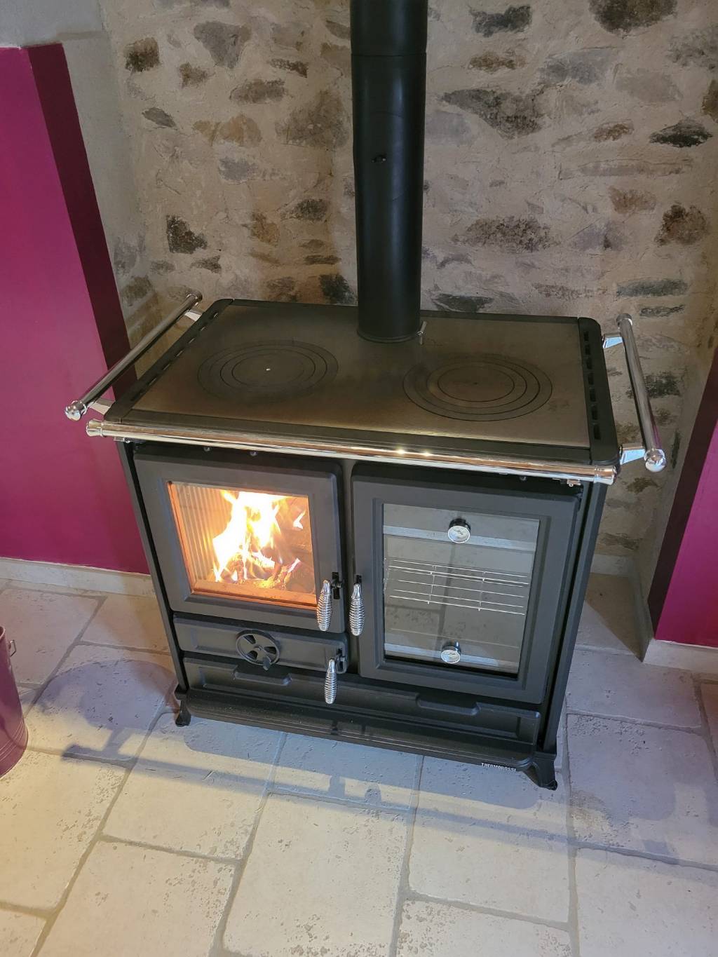 Cette installation permet de bénéficier d’un chauffage au bois traditionnel tout en conservant des capacités de cuisson performantes grâce aux deux fours séparés et aux plaques de cuisson en fonte à l'ancienne.