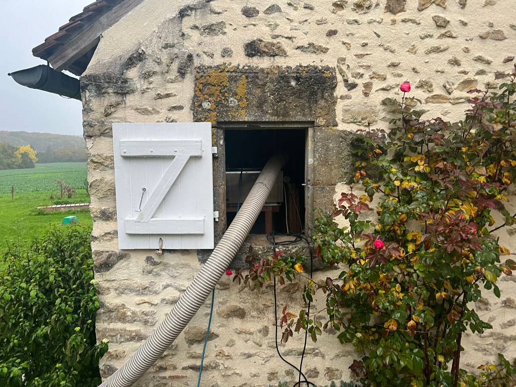 Une livraison de 3 tonnes de granulés de bois 100 % résineux a été effectuée sur la commune de Verneuil. L’accès au site s’est fait par un chemin en gravillons, puis la mise en place d’une longueur de tuyau sur pelouse a permis d’atteindre l’entrée du silo.