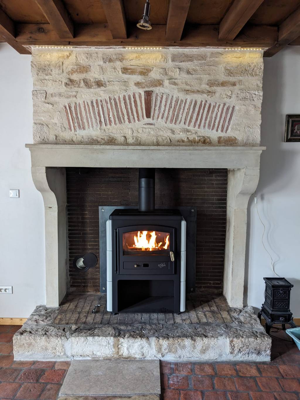 L’installation d’un poêle à bois Godin modèle Eco a été réalisée dans une ancienne cheminée située dans une habitation à Moraches, dans la Nièvre. Le foyer existant a été préparé et adapté pour accueillir l’appareil, incluant le nettoyage et la vérification du conduit.