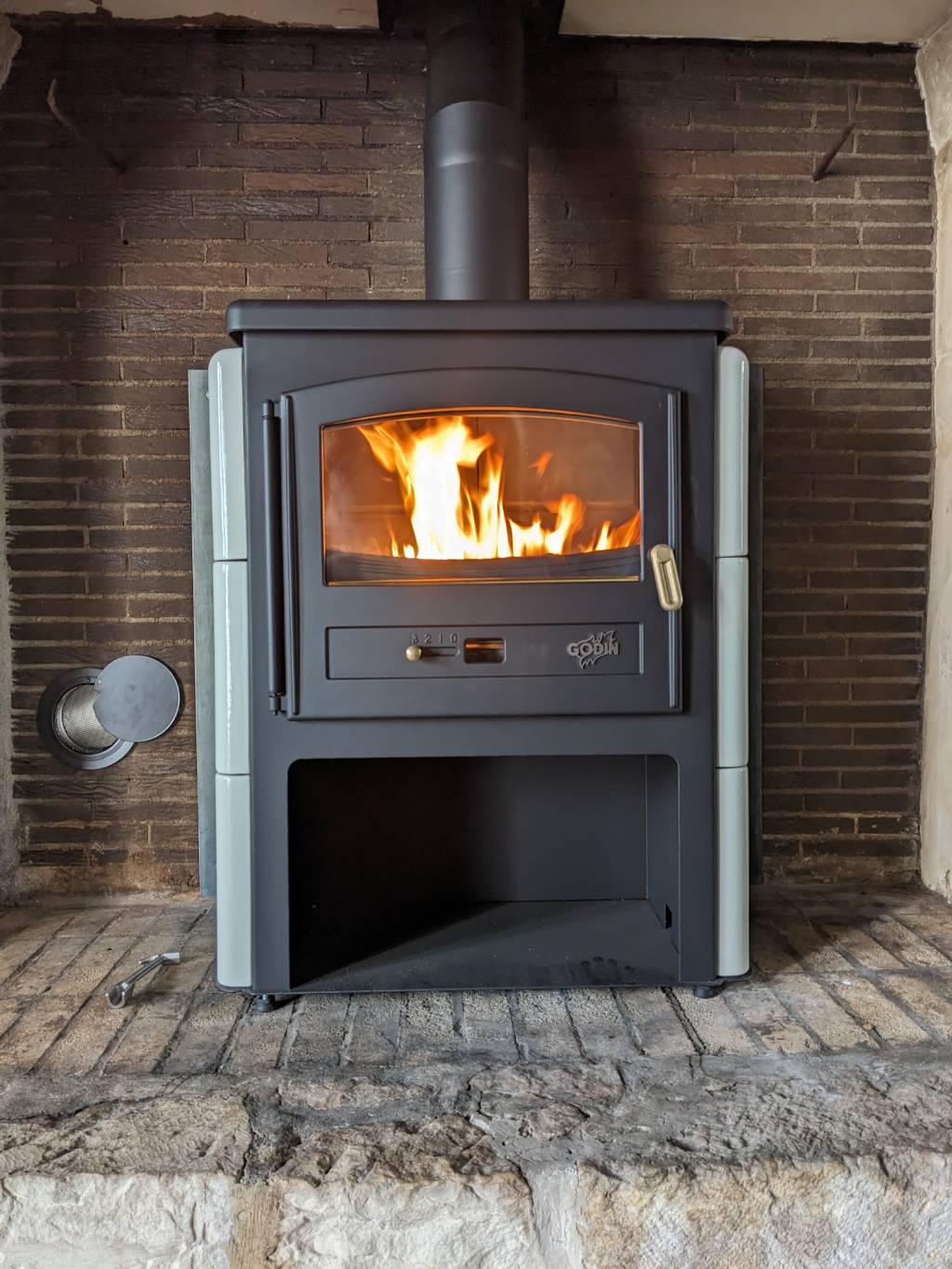 Le poêle Godin a ensuite été positionné et raccordé au conduit tubé, en respectant les distances de sécurité et les prescriptions techniques du fabricant.