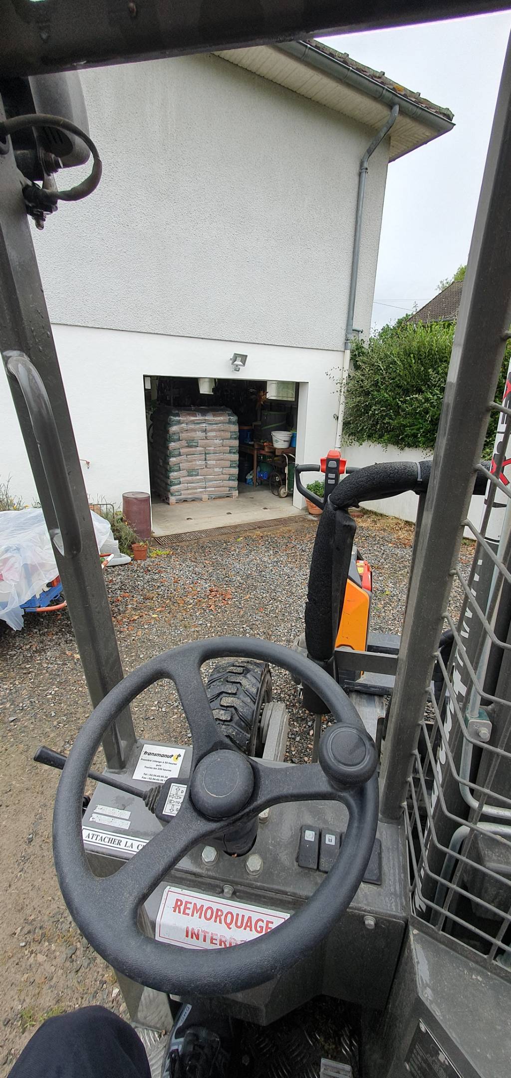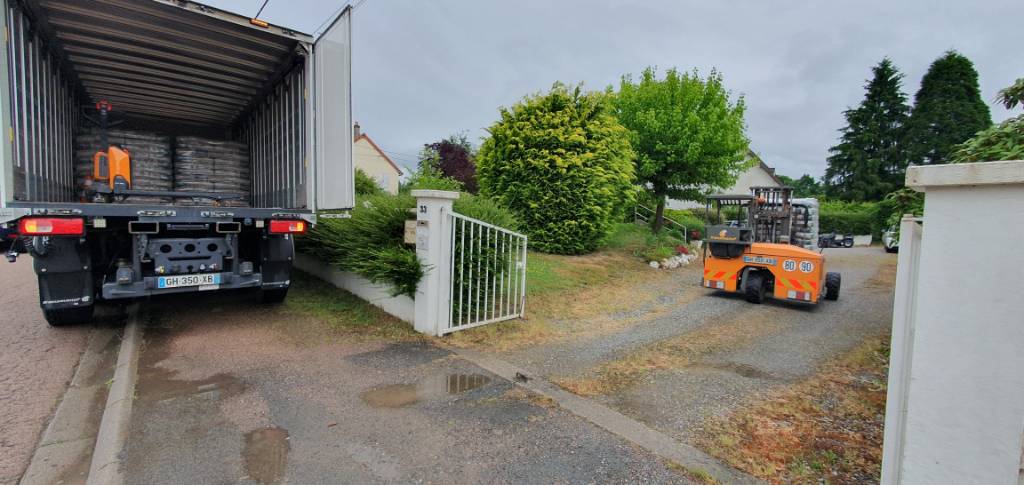 Le site était facilement accessible, avec une cour gravillonnée, toutefois l’utilisation d’un transpalette a été nécessaire pour positionner précisément la palette à l’emplacement souhaité par le client.