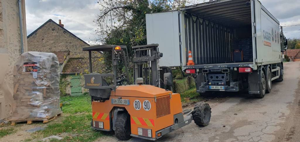 La palette a été livrée devant l’habitation, puis la manutention et le rangement ont été effectués par les clients dans leur espace de stockage.