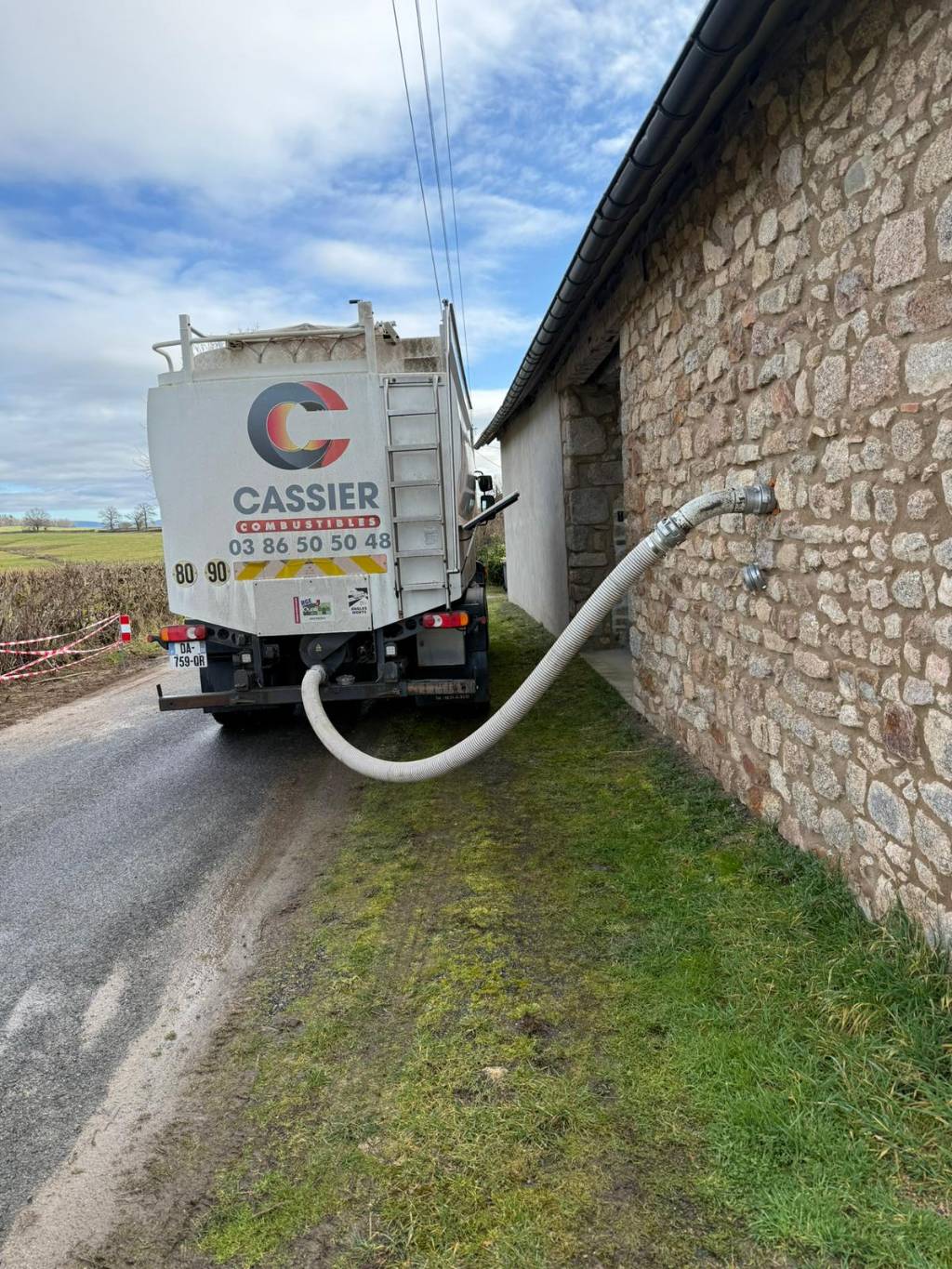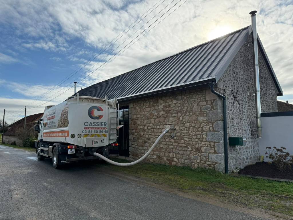 Livraison de 2,5 tonnes de pellets en vrac 100 % résineux avec un camion souffleur muni d'une pesée embarquée et aspiration de fines. Livraison se faisant en se garant le long de la chaufferie avec bouche de remplissage sur le mur permettant de souffler les granulés directement de l'extérieur