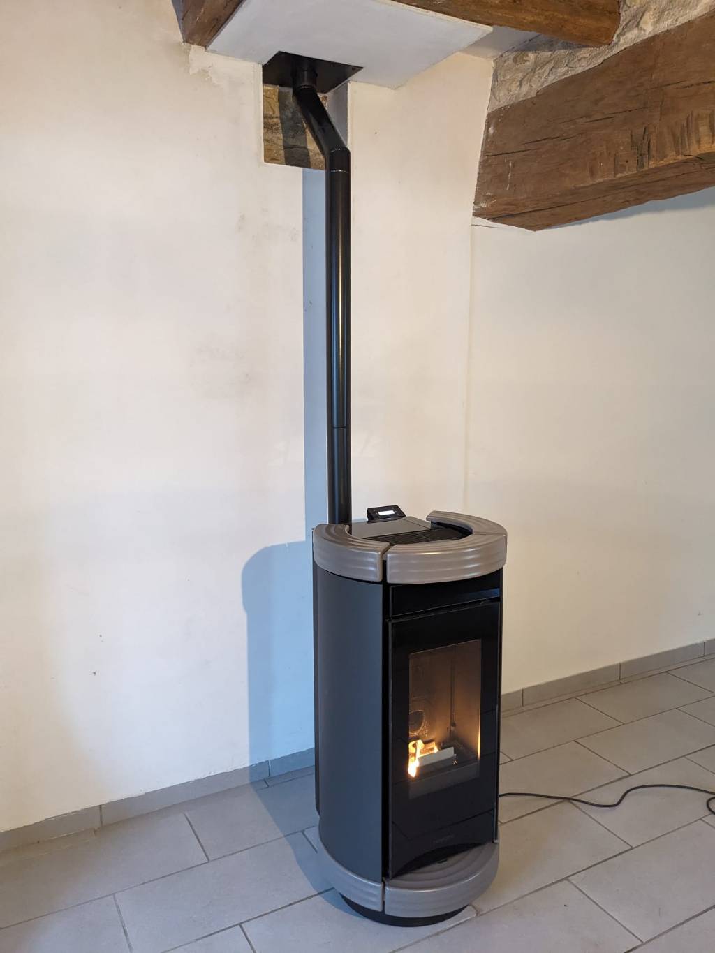 Installation d'un poêle à granulés de bois Thermorossi, modèle Dorica, en remplacement d'un poêle à bois. Nous avons tubé la cheminée existante en diamètre 100 et raccordé le poêle au tubage en diamètre 80 avec création d'une arrivée d'air primaire.