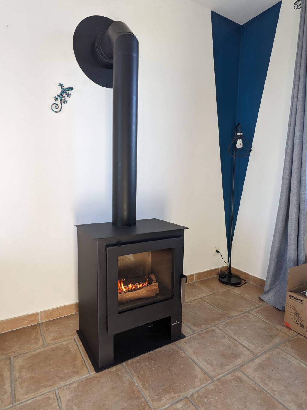 Installation d'un poêle à bois bûches de la marque Laudevco modèle Gijon avec création de conduit extérieur en double paroi isolé en diamètre 150. Création d'une arrivée d'air indirect.